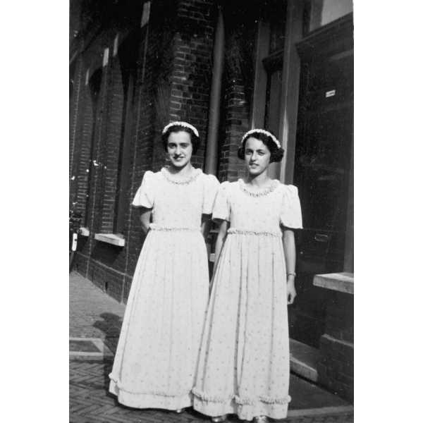 Rebecca's achternichtjes Mary de Raaij en haar zusje Duifje (Dolly) als bruidsmeisjes bij het huwelijk van Izaak (Ies) Stranders uit Rossum en Jeannette Henriëtte (Nettie) Mozes uit Vierlingsbeek in 1937. Bron: Joods Historisch Museum (jck.nl); copyright: public domain.