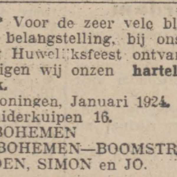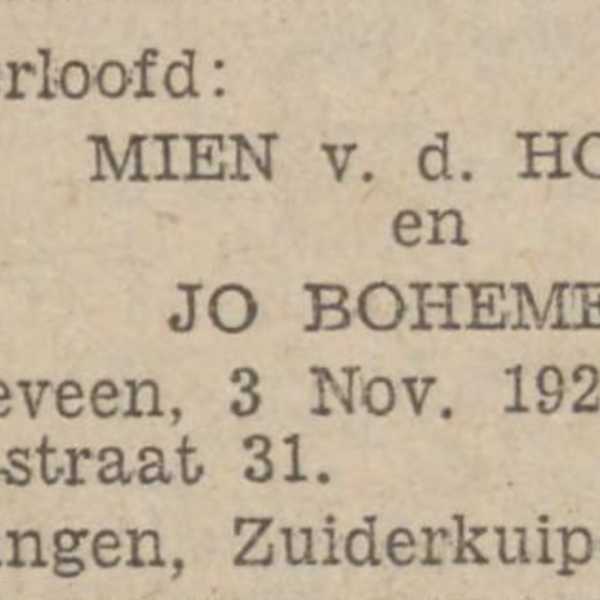 Hun vader wordt ziek en overlijdt in mei 1926 op 53-jarige leeftijd. Jo is dan 23. Uit de rouwadvertentie blijkt dat Coenraad en Simon inmiddels verloofd zijn, maar Jo nog niet. Dat verandert in november 1929, want dan verlooft Jo zich met Mien van der Horst. Maar tot een huwelijk met Mien is het nooit gekomen.