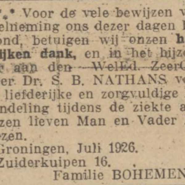 Joel Bohemen ("Jo") wordt op 15 november 1902 geboren in Groningen. Na Coenraad (1899) en Simon (1901) is hij de derde zoon van koopman Abraham Bohemen en zijn echtgenote Hinderina Boomstra. De broers zijn alle drie sportief. Ze doen aan gymnastiek en atletiek, maar Jo speelt ook wel eens een potje vuistbal.
