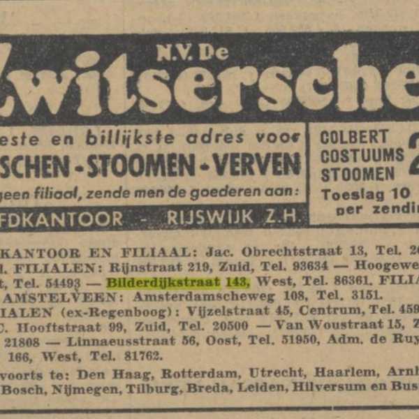 Op het adres Bilderdijkstraat 143 huis zit na de oorlog nog jarenlang een filiaal van 'De Zwitsersche'.