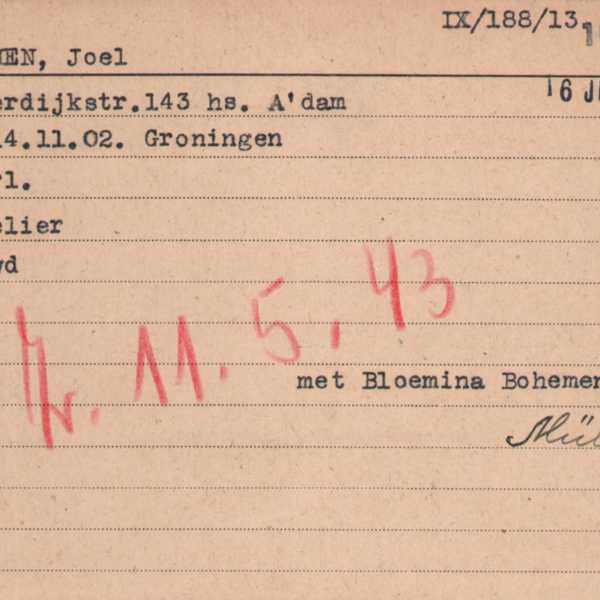 Maar dan begint de oorlog. Hoe Jo en Bloemina de eerste oorlogsjaren zijn doorkomen en hoe lang het filiaal nog in bedrijf is gebleven is niet bekend, maar in de zomer van 1942 moeten Jo en Bloemina hun huis aan de Bilderdijkstraat verlaten. Na enkele maanden in Kamp Westerbork worden ze op 11 mei 1943 'als gestraften' gedeporteerd naar Sobibor, waar ze op 14 mei, direct na aankomst, worden vermoord.