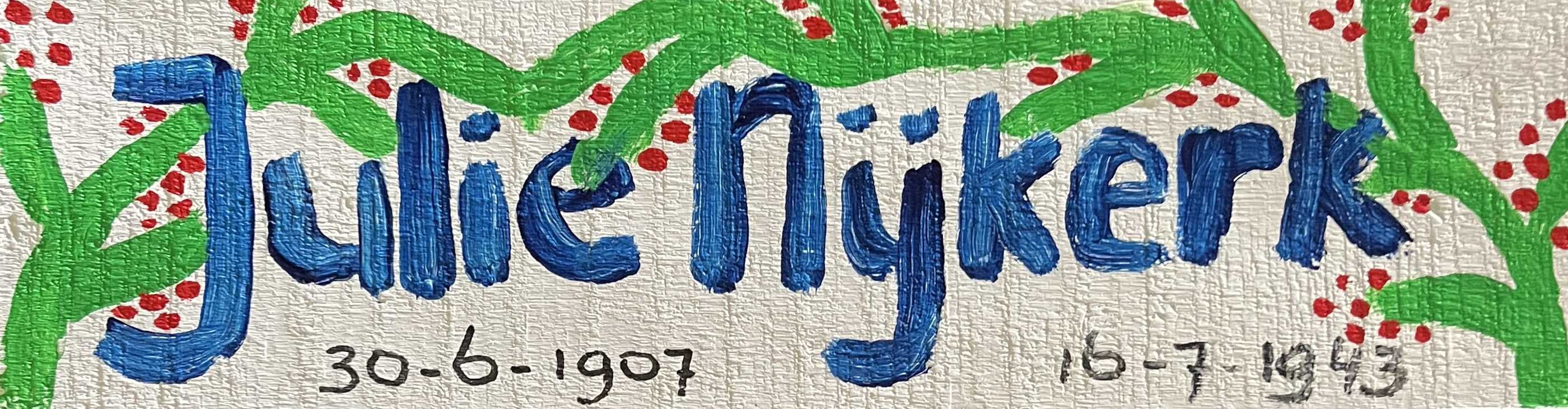 Als ik vanuit mijn huis naar de overkant kijk, woonde op Overtoom nummer 53 tweehoog Julie Virgini Nijkerk. Ze is geboren in 1907 in Amsterdam. Ze is het jongste kind van het gezin Nijkerk. Een nakomertje. Haar ouders waren Mozes Elias Nijkerk en Maria de Jong.