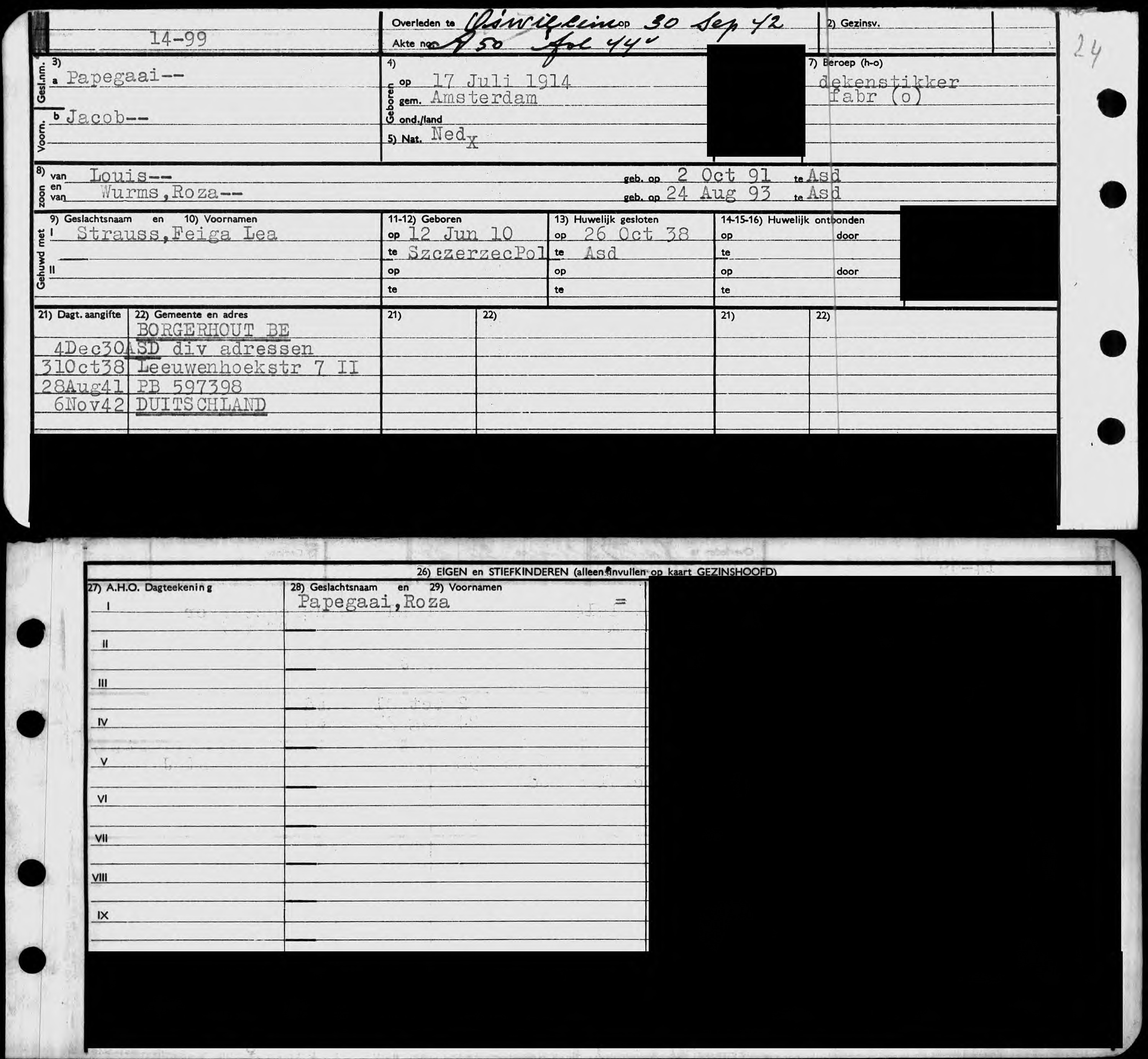 Zijn vrouw Feiga (38) was een vluchtelinge uit Szczersec, destijds Pools, nu Oekraïens. In Szczersec woonde voor de Tweede Wereldoorlog een Joodse meerderheid (90%). Na de inval van de nazi’s vonden er bloedbaden plaats en werd de joodse bevolking afgevoerd naar de vernietigingskampen Belsec en Auschwitz. Slechts een enkeling kon vluchten, op Joods Monument zijn drie namen te vinden van mensen die in Nederland terecht kwamen. Maar Feiga en dochtertje Roza (2 jaar) werden op 29 juli 1942 alsnog in Auschwitz vermoord.