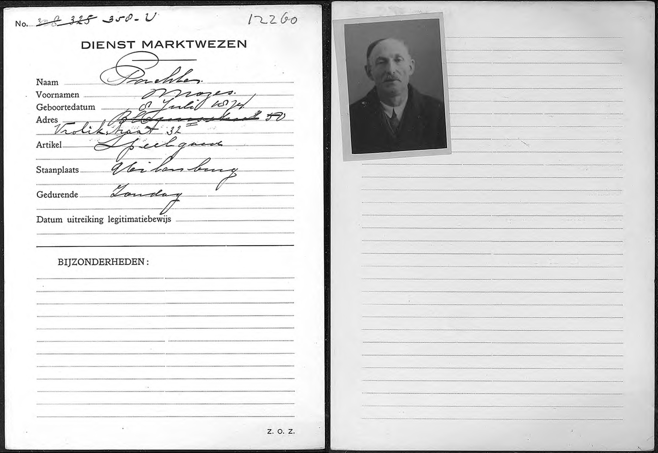 Mozes Pachter werd op 8 juli 1874 te Amsterdam geboren. Hij wordt op 19-jarige leeftijd vrijgesteld van militaire dienst wegens 'lichamelijke gebreken'. Hij is marktkoopman en heeft op zondagen een standplaats met speelgoed. Mozes woont dan nog in de Vrolikstraat, ook Amsterdam oost.