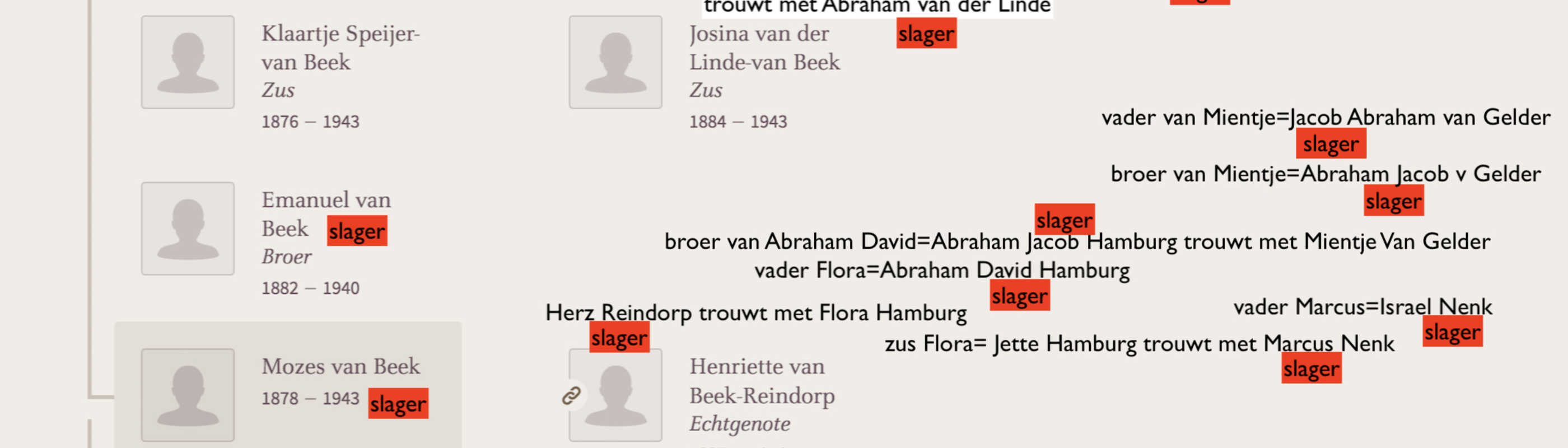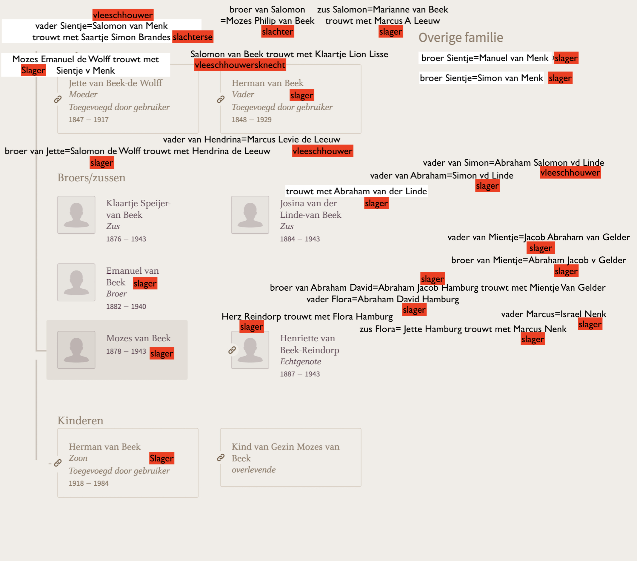 Wat begon als een klein verhaal om iemand uit mijn buurt te herdenken, werd een steeds groter web, een web van familie vertakkingen waarbij elke tak weer een slager of slachter bleek te zijn geweest. Mozes van Beek, mijn persoon om te herdenken die het dichtst bij mijn huis had gewoond, was slager van beroep geweest. Mijn vader was ook slager in hart en nieren geweest en daarbij veel te jong op zijn 61ste overleden. Het herdenken van Mozes ging plots samenvallen met mijn eigen verleden en verdriet. De vader van Mozes, Herman van Beek: slager, zo ook de vader van Herman, Salomon: vleeschhouwer. Broer Emanuel: slager! Zijn zus Josina was met slager Abraham van der Linde getrouwd. De vader van Abraham was vleeschhouwer. Ook in de familie van de moeder van Mozes, Jette de Wolff wemelt het van de slagers. Haar vader: slager. Haar opa van moederskant Salomon van Menk: vleeschhouwer en mijn favoriet: de vrouw van Salomon, Saartje Simon Brandes: slachterse!