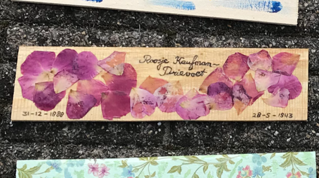 Het gedenkplaatje is vormgegeven met gedroogde rozenblaadjes. Roosjes ter nagedachtenis aan Roosje.