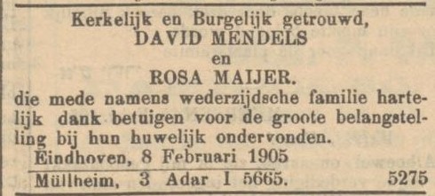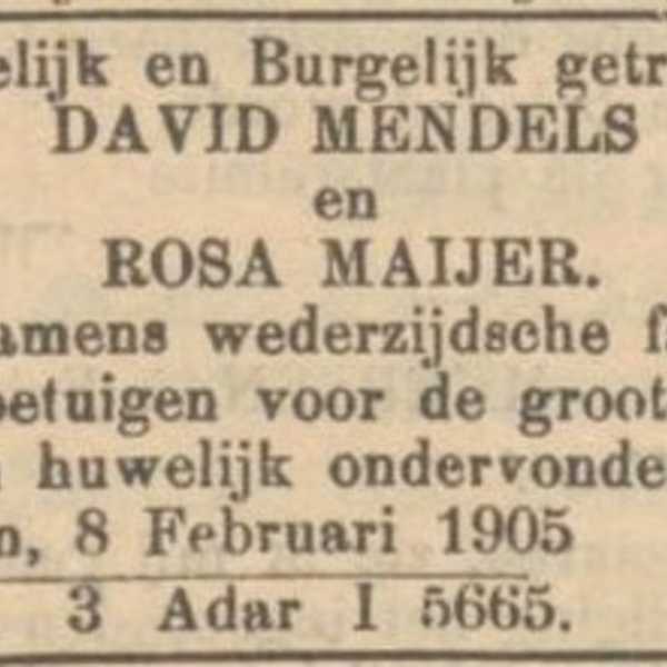 Rosa is de zus van Hermine Snatager-Mayer. Rosa kwam in januari 1905, 26 jaar oud, van Mullheim naar Eindhoven om te trouwen met de vijf jaar oudere David Mendels. Haar moeder was toen al overleden, maar haar vader was bij het huwelijk aanwezig, dus Hermine mogelijk ook.