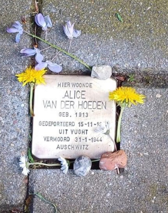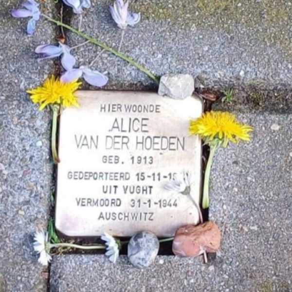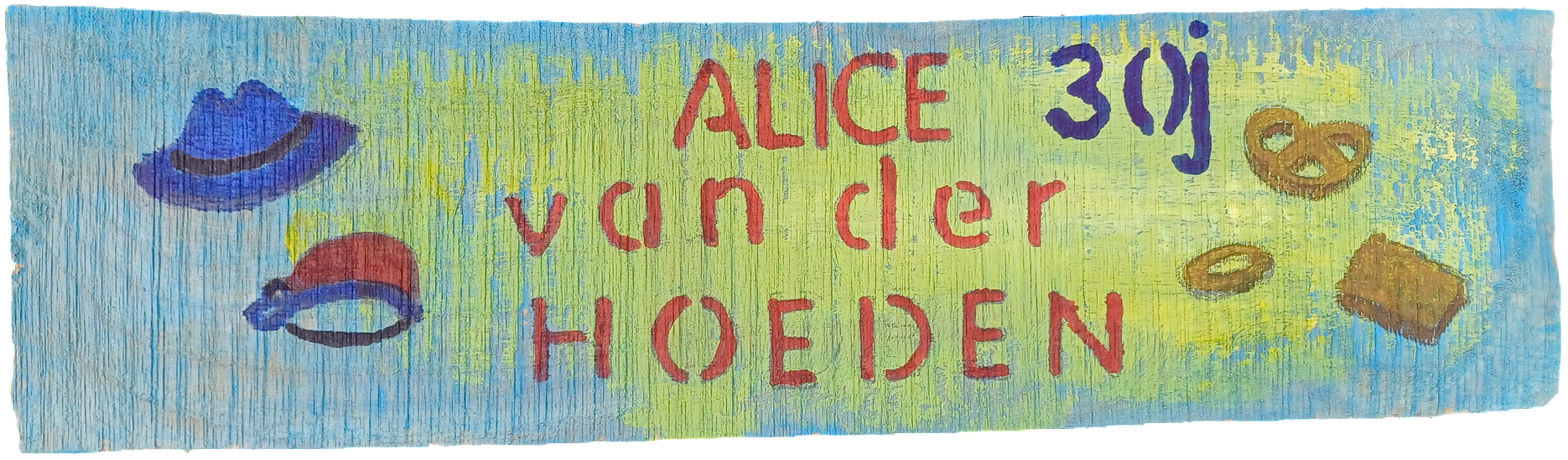 Uitleg over het naambordje: Er staan hoeden en koekjes op: Hoeden is haar familienaam en Alice maakte reclame voor De Beukelaer koekjes. Zie foto's op Joodsmonument.nl.