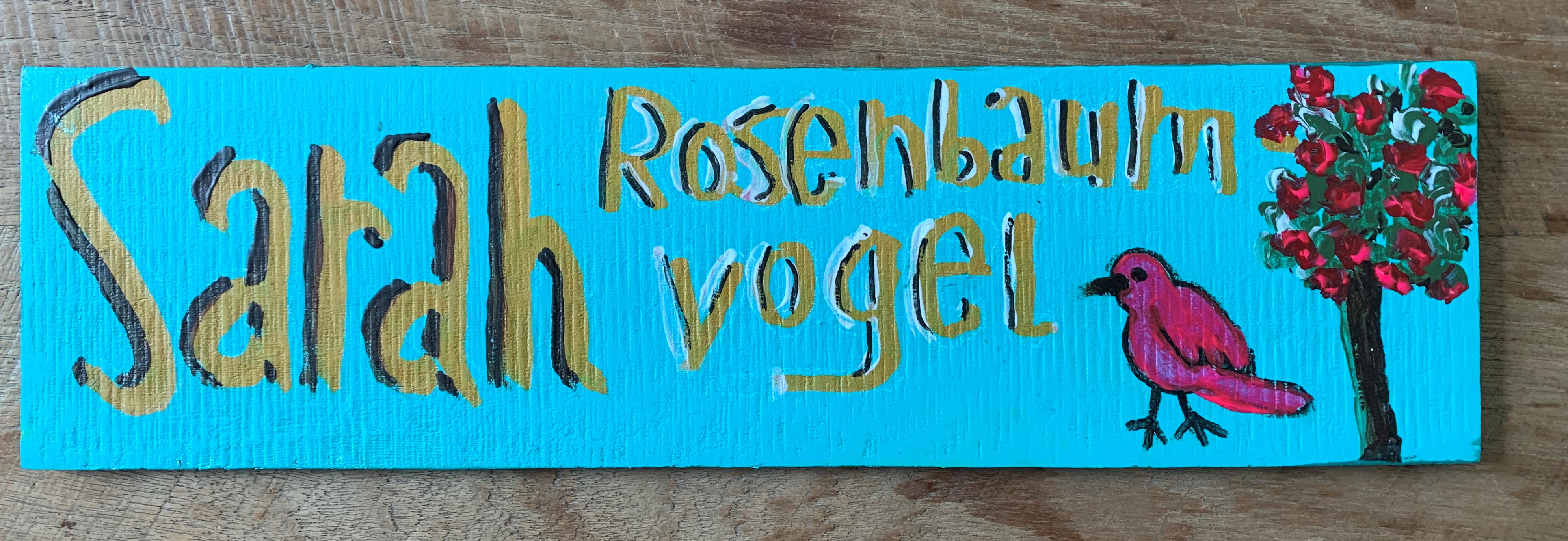 Op het naambordje heb ik een rozenboom gemaakt, wat ik wel mooi vond omdat de achternaam Rosenbaum is. Daarnaast een symbool van een vogel, de meisjesnaam van Sarah.