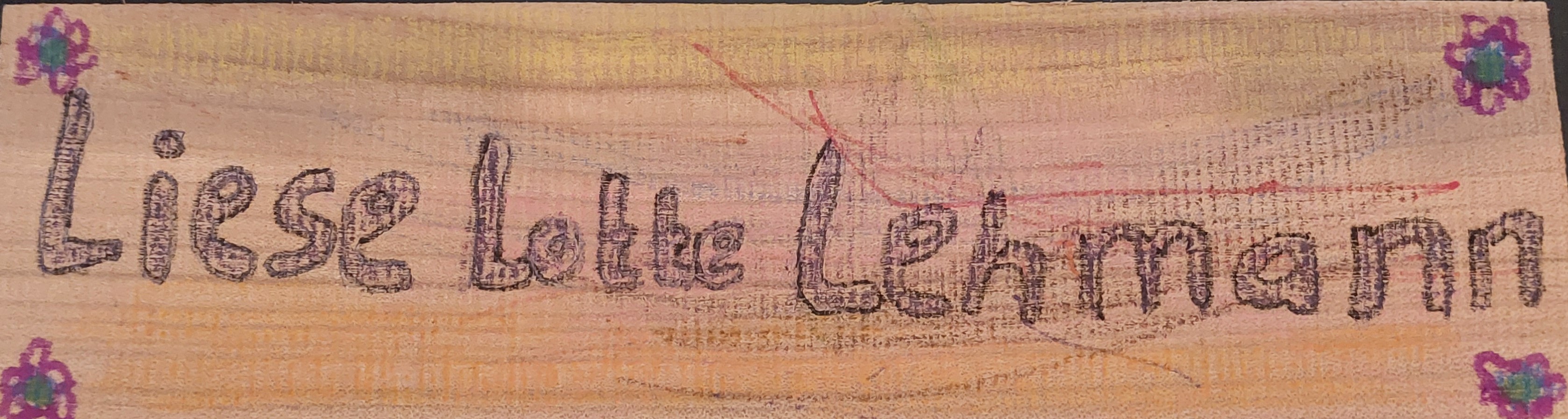 Ik heb met mijn kleindochter Violet van twee jaar een naambordje gemaakt. We zochten een mooie naam van een meisje en dat was Liese Lotte. Ze is helaas maar 15 jaar geworden. Haar laatste woonplaats was in Limburg. Daar komen de andere opa en oma van Violet ook vandaan. Het is blijkbaar niet duidelijk waar ze om het leven is gekomen. Via Joodsmonument.nl begrepen we dat er twee scenario's over haar verdwijning zijn. Haar lichaam is helaas nooit gevonden. Na de oorlog is ze officieel dood verklaard. Een ongelofelijk triest einde.
