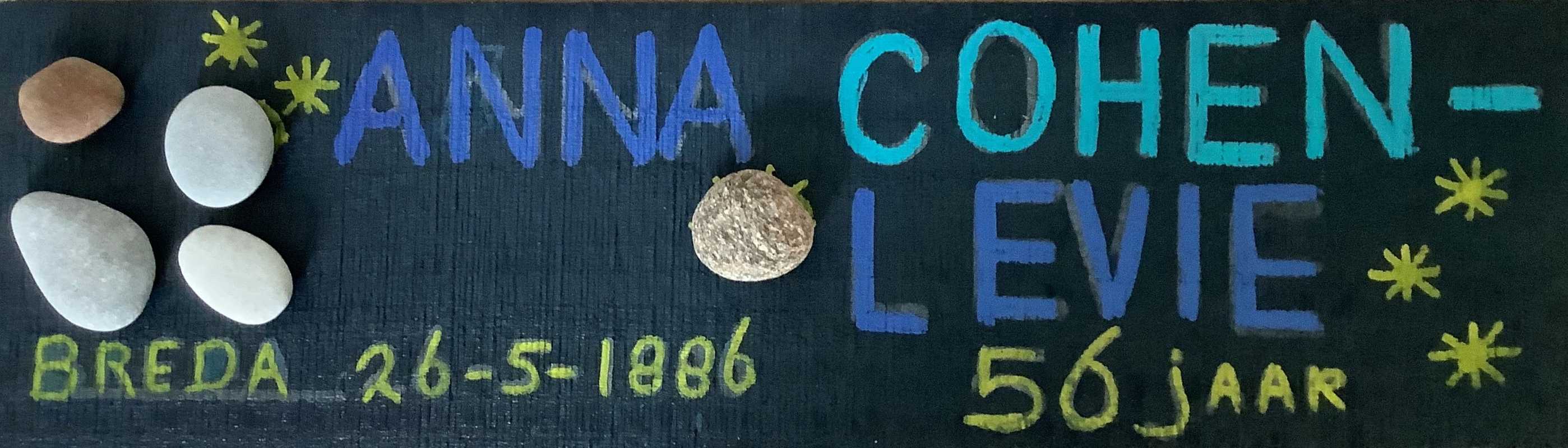 Op het naambordje van Anna heb ik steentjes gelegd. Volgens Joods gebruik laat je een steen achter na bezoek aan het graf, ten teken dat je geweest bent en de dode herdenkt - dat is wat nu gebeurt.