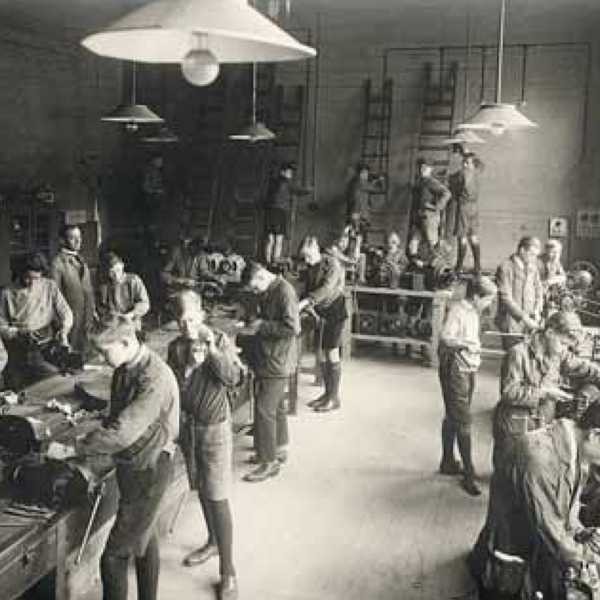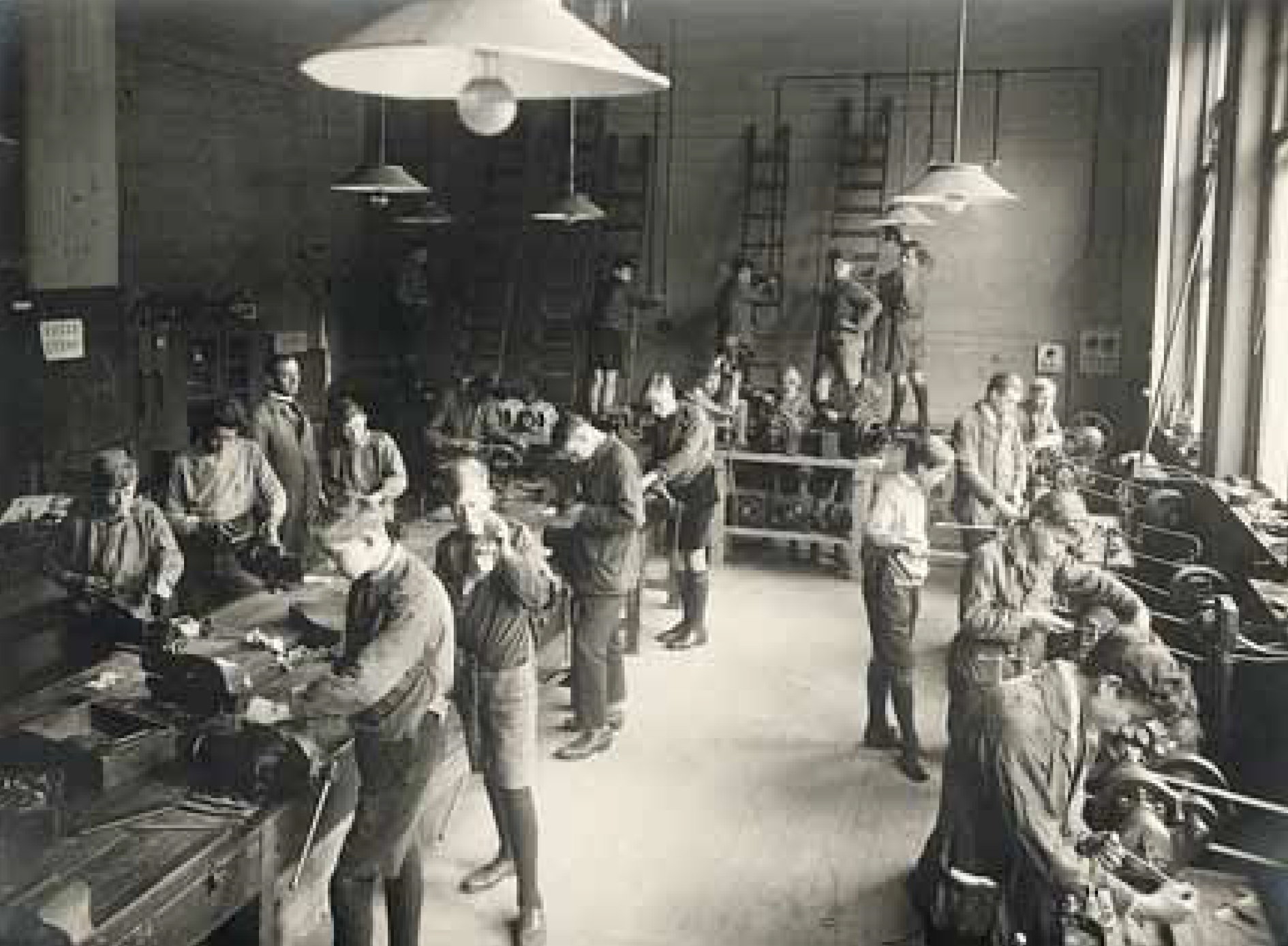 Elektriciëns in opleiding op een collega-ambachtsschool rond 1925.