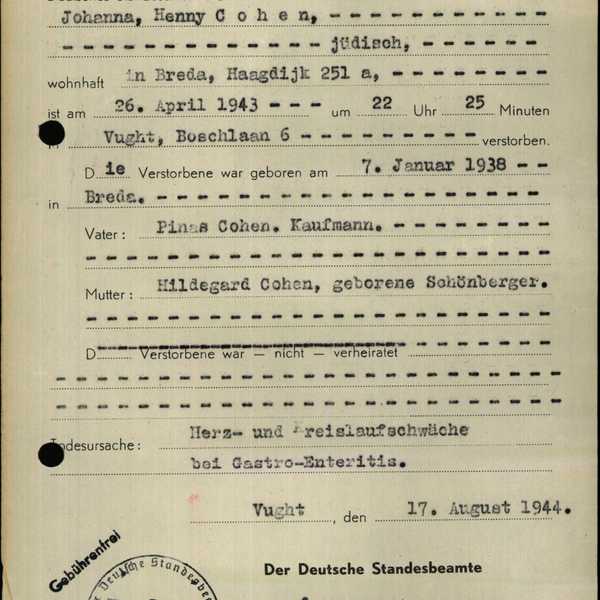 Ik weet niet wat je zag van de oorlog. Je was nog klein toen er andere mensen de baas in Nederland werden. Ook in Breda. En er nare en gemene dingen bedacht werden, zoals dat Joodse mensen niet meer mochten werken en niet meer mochten wonen waar ze woonden. Misschien hebben jouw papa en mama zich ook afgevraagd wat ze moesten doen. Wat ze konden doen. En voor je het weet is het te laat. Als ik het goed heb zijn jullie op 3 augustus 1942 naar een kamp gebracht. Een plek waar de mensen bij elkaar moesten wonen om van daaruit weer ergens anders heen te gaan, gaan werken in Duitsland werd er gezegd. Jullie moesten naar Kamp Vught. Je bent dan 4 jaar. Dezelfde gemene mensen hadden bedacht dat kindjes van ouder dan 4 jaar niet bij hun papa's en mama's moesten wonen. Jullie waren te druk. Dus gingen jullie met alle kindjes bij elkaar wonen. Dat was niet fijn en bovendien een heel slecht plan. Er moesten vreemde mensen voor jullie zorgen die dat niet goed deden. Het was er vies. En het eten was slecht. En jij lieve meid, jij werd ziek. Heel erg ziek. En je ging dood. Op 26 april 1943 rond half 11 's avonds.