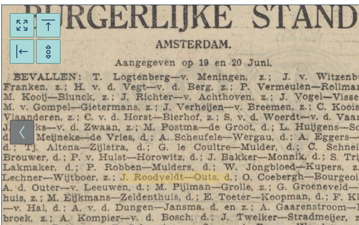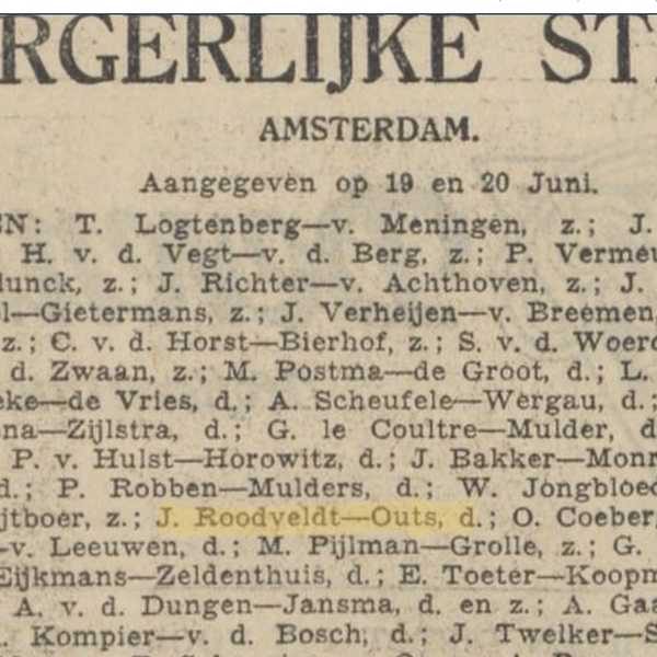 Johanna Roodveldt, je werd op 2 december 1902 geboren in Amsterdam als Johanna Outs. Je bent de dochter van Christiaan Outs, diamantsnijder en Sara de Swarte.