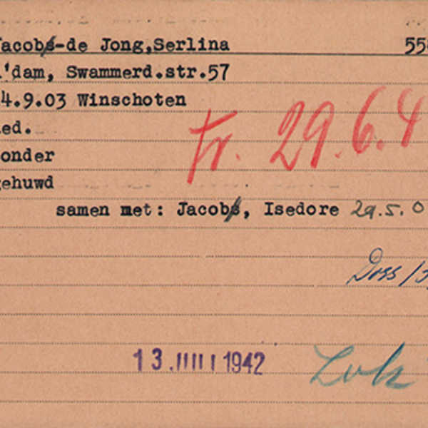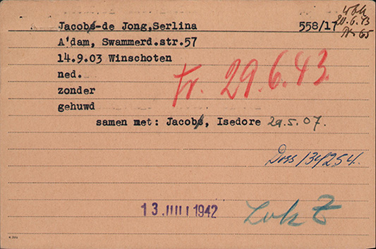 Op de kaart van het Duitse Arolsen Archief stond zij ingeschreven op het adres Swammerdamstraat 57 hs.