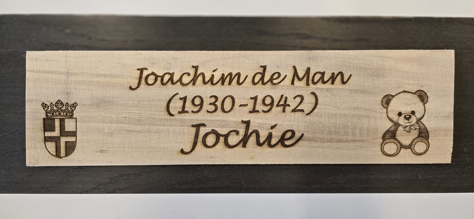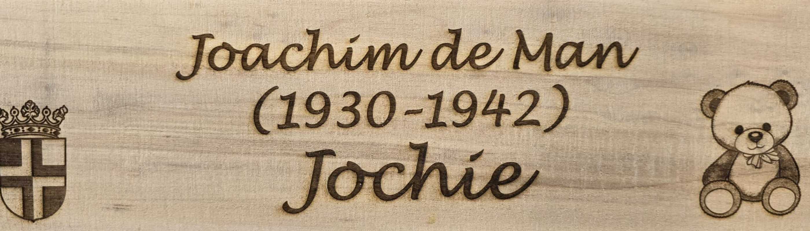 In het plankje van Jochie is zijn naam en de jaren waarin hij leefde gebrand. Links het wapen van de gemeente Sint-Michielsgestel, rechts een beertje. Het beertje staat symbool voor het feit dat de kinderen nog niet volwassen waren. Ook is het een verwijzing naar de beer van Berlicum.