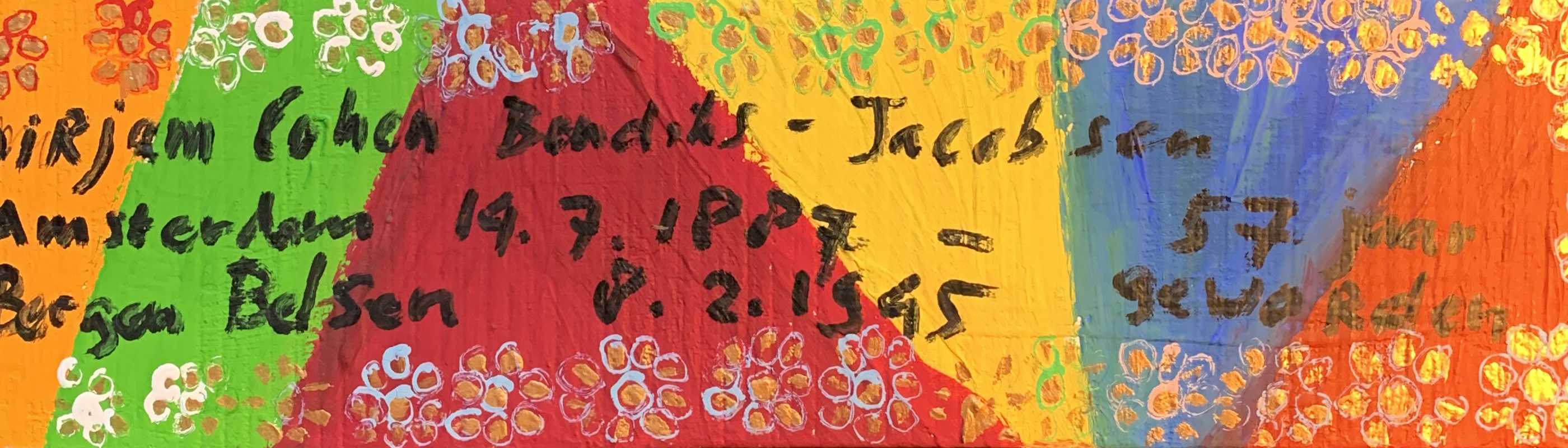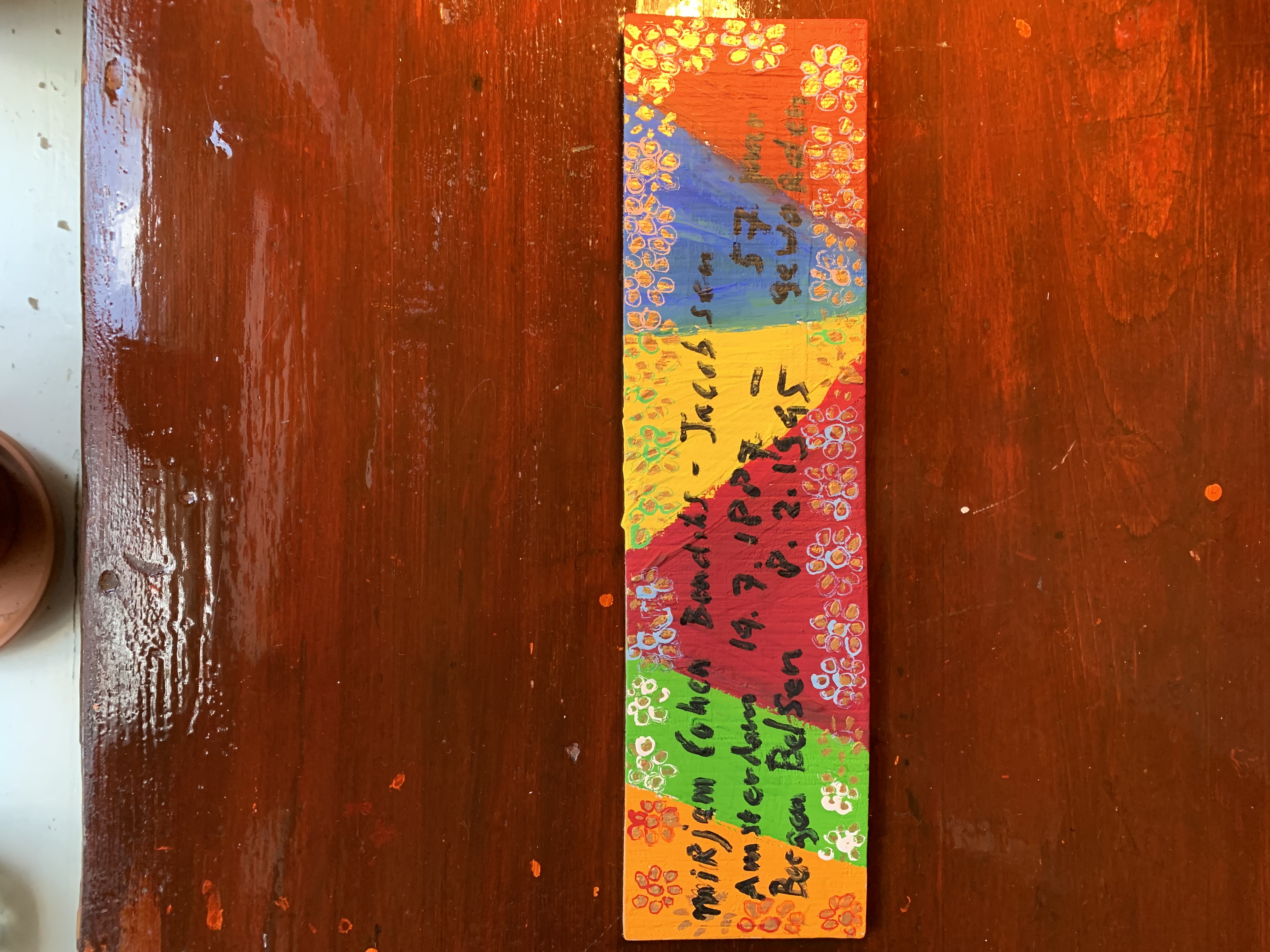 Ik heb gekozen om het naambord met gekleurde driehoekige vlakken te beschilderen die verwijzen naar de Davidster. Ook heb ik goudkleurige bloemetjes rond haar naam gemaakt omdat ze een getrouwde vrouw was. Haar naam, geboortedatum en overlijdensdatum en de plaatsen heb ik natuurlijk met een zwarte acrylverfpen gedaan.