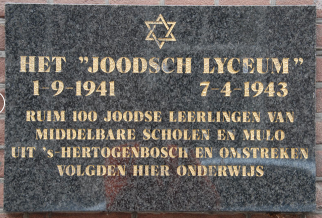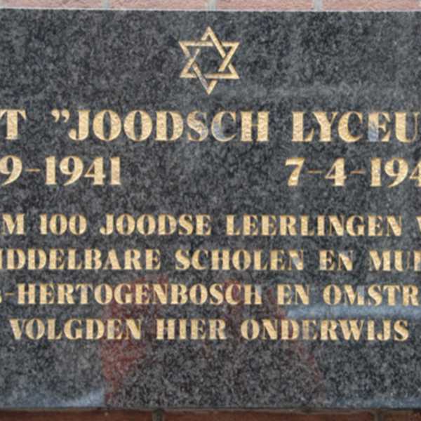 Foto 5 Plaquette aan de gevel van het voormalige Joodse Lyceum Papenhulst 7 in Den Bosch hangt.