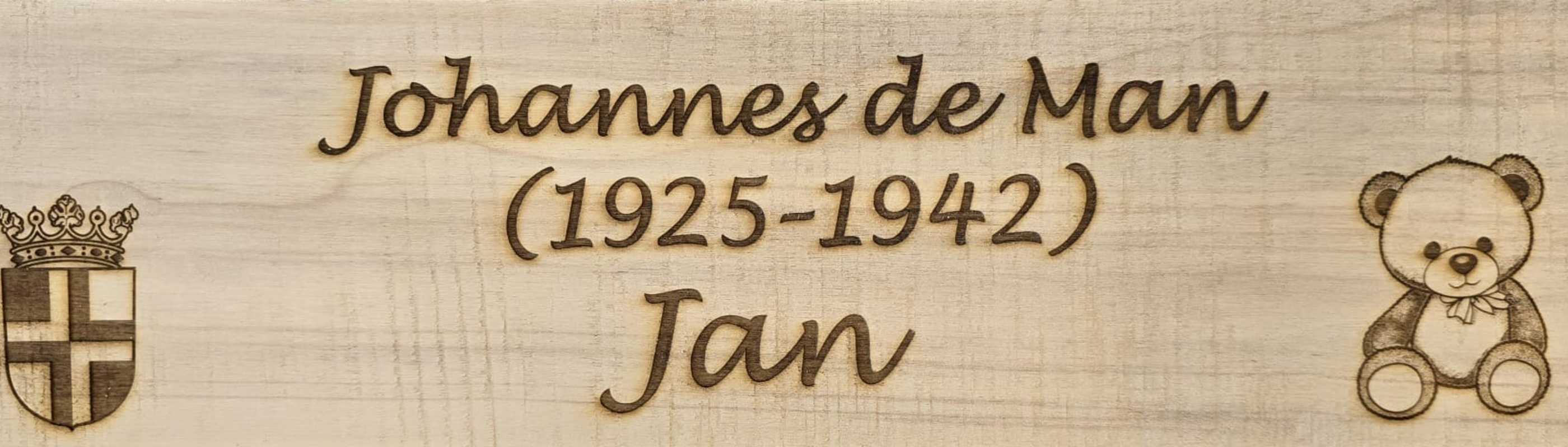 In het plankje van Jan is zijn naam gebrand en de jaren waarin hij leefde. Links het wapen van de gemeente Sint-Michielsgestel, rechts een beertje. Het beertje staat symbool voor het feit dat de kinderen De Man nog niet volwassen waren. Ook is het een verwijzing naar de beer van Berlicum.