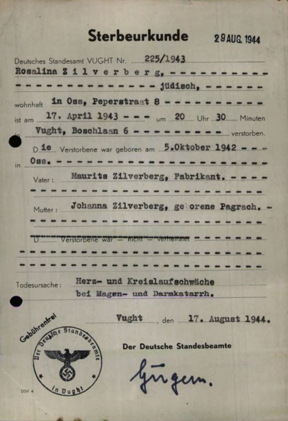 Begin 1943 is ze met haar moeder naar concentratiekamp Vught gebracht alwaar zij op 17 april 1943 om 20.30 uur is overleden. Als doodsoorzaak wordt genoemd: Herz- und Kreislaufswäche bei Magen- und Darmkatarrh (zwakte van hart en bloedsomloop bij gastro-enteritis). Waarschijnlijk is zij het jongste Osse slachtoffer van de Holocaust.