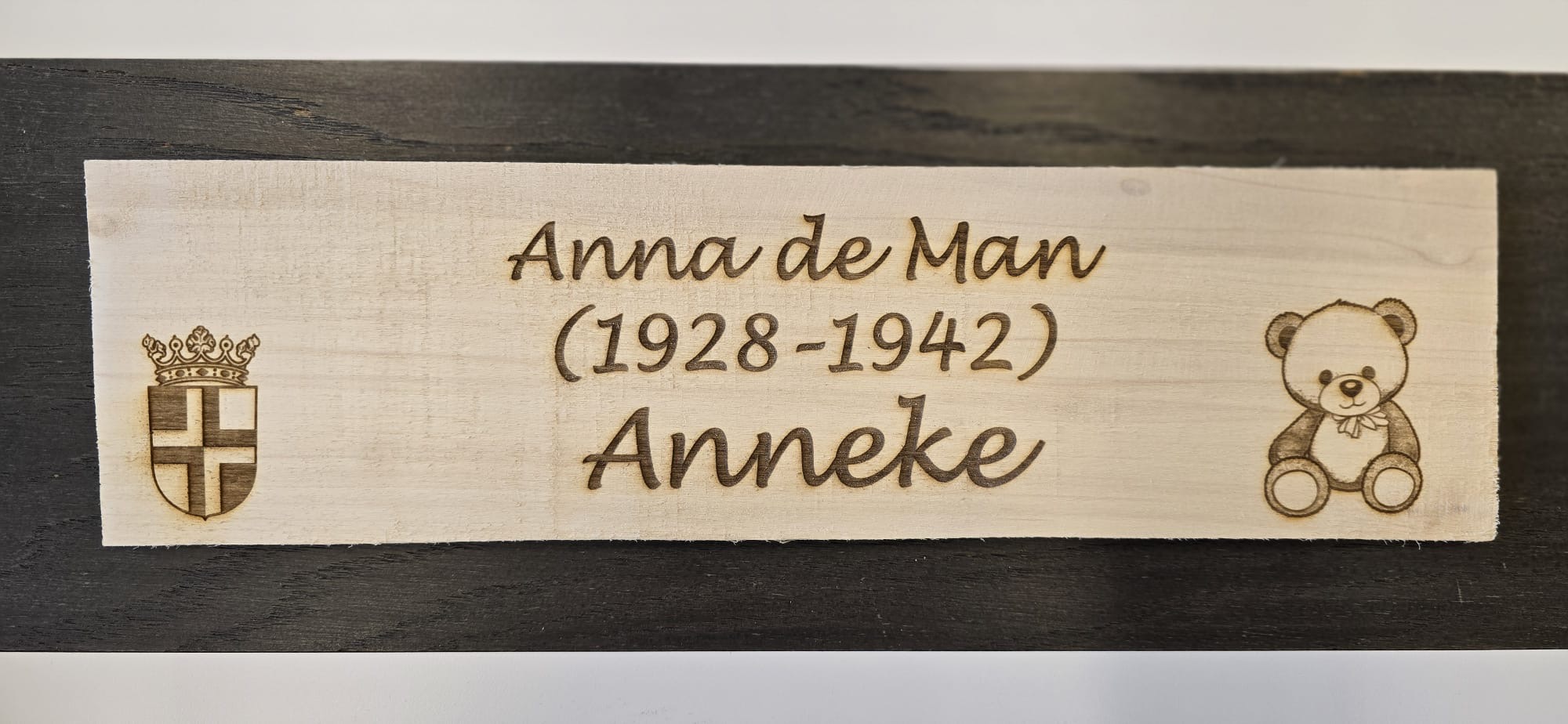 In het plankje van Anneke is haar naam gebrand en de jaren waarin zij leefde. Links het wapen van de gemeente Sint-Michielsgestel, rechts een beertje. Het beertje staat symbool voor het feit dat de kinderen nog niet volwassen waren. Ook is het een verwijzing naar de beer van Berlicum.