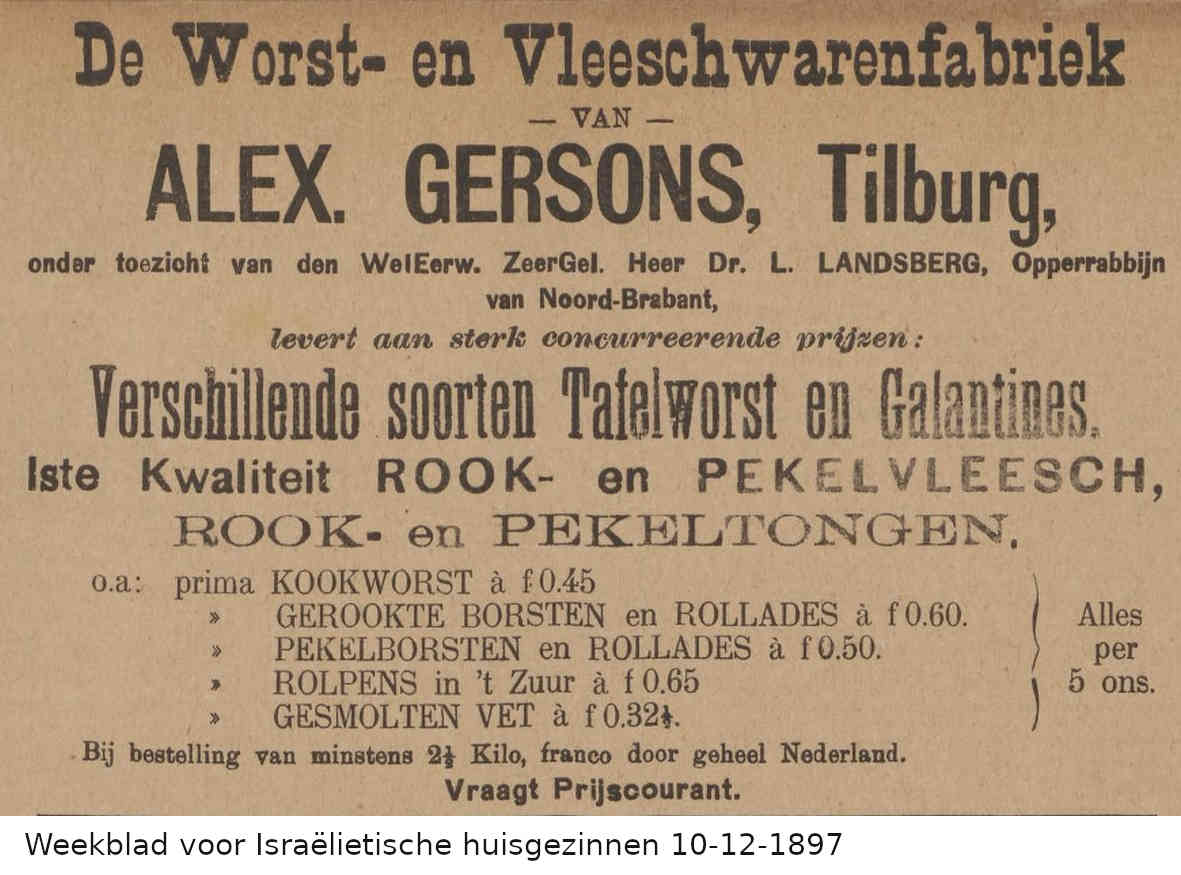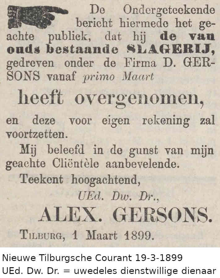 In 1897-1898 adverteert Alexander regelmatig in het 'Weekblad voor Israëlietische huisgezinnen' als fabrikant van koosjere worst- en vleeswaren bij wie men uit het hele land kan bestellen. Met deze advertenties stopt hij, als hij in maart 1899 de slagerij overneemt die van zijn grootvader is geweest. In datzelfde jaar trouwt hij met Betje de Jonge. Zij blijven wonen in het huis waarin hij is opgegroeid: St. Annaplein 13 (nu: Lieve Vrouweplein 13). Ook zijn oom Jacques, die eveneens slager is, blijft daar wonen.