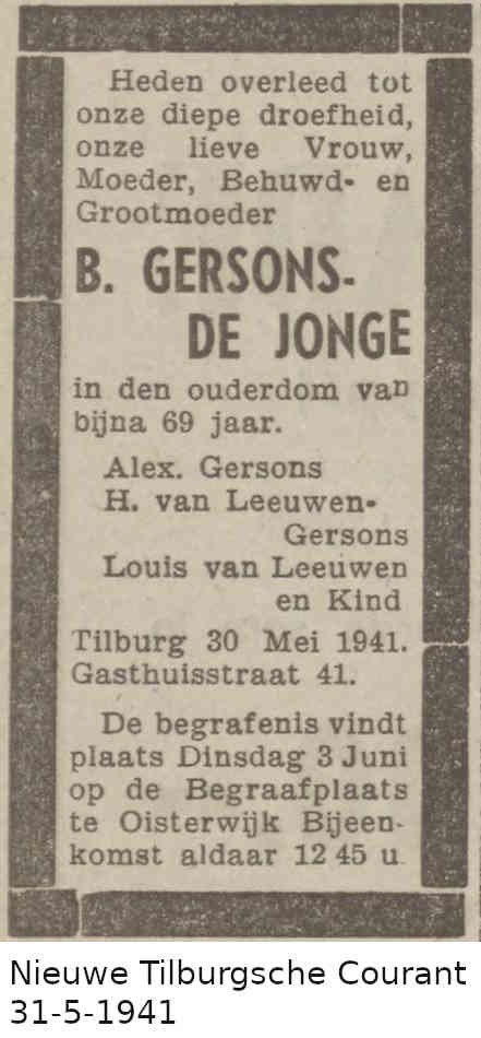 Volgens de burgerlijke stand van Tilburg is Alexander Gerson op 6 september 1944 in de omgeving van Oswiecim in Polen overleden. Bij zijn overlijden is hij 75 jaar.