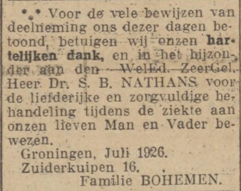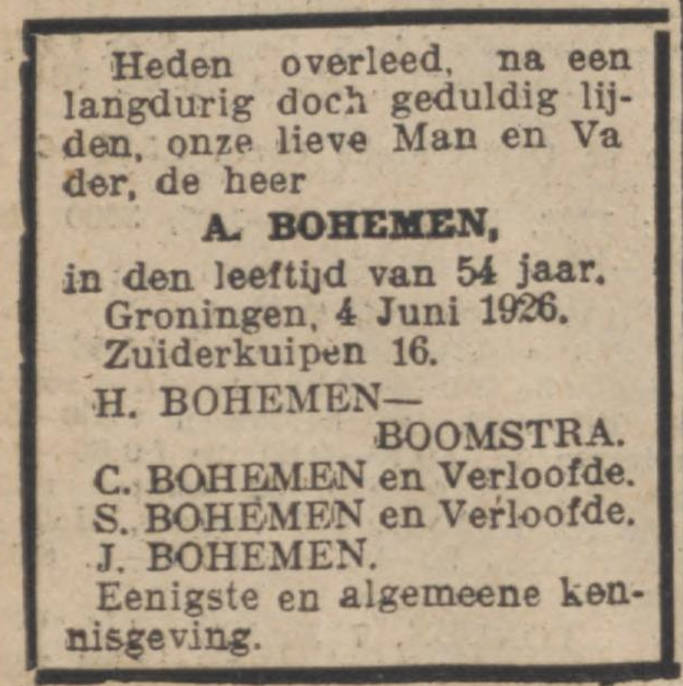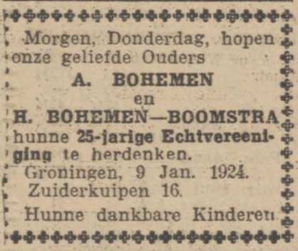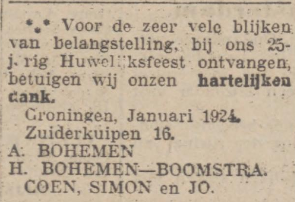 Op 8 maart 1939 trouwt Jo Bohemen in Amsterdam met Bloemina Elshof uit Groningen, en in april beginnen ze een filiaal van 'De Zwitsersche' op het adres Bilderdijkstraat 143. Ze wonen achter de winkel. Ook Jo's moeder, de weduwe Hindera Bohemen-Boomstra, verruilt dat jaar Groningen voor Amsterdam. Ze woont eerst een paar maanden in bij Jo en Bloemina en betrekt dan een huis in de Kinkerstraat. Gezellig dichtbij.
