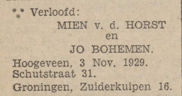 Hun vader wordt ziek en overlijdt in mei 1926 op 53-jarige leeftijd. Jo is dan 23. Uit de rouwadvertentie blijkt dat Coenraad en Simon inmiddels verloofd zijn, maar Jo nog niet. Dat verandert in november 1929, want dan verlooft Jo zich met Mien van der Horst. Maar tot een huwelijk met Mien is het nooit gekomen.