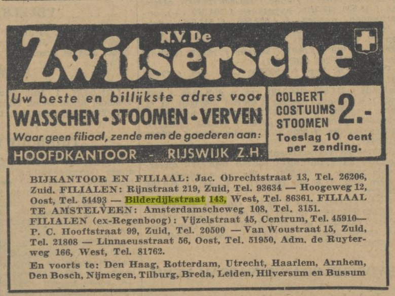 Op het adres Bilderdijkstraat 143 huis zit na de oorlog nog jarenlang een filiaal van 'De Zwitsersche'.