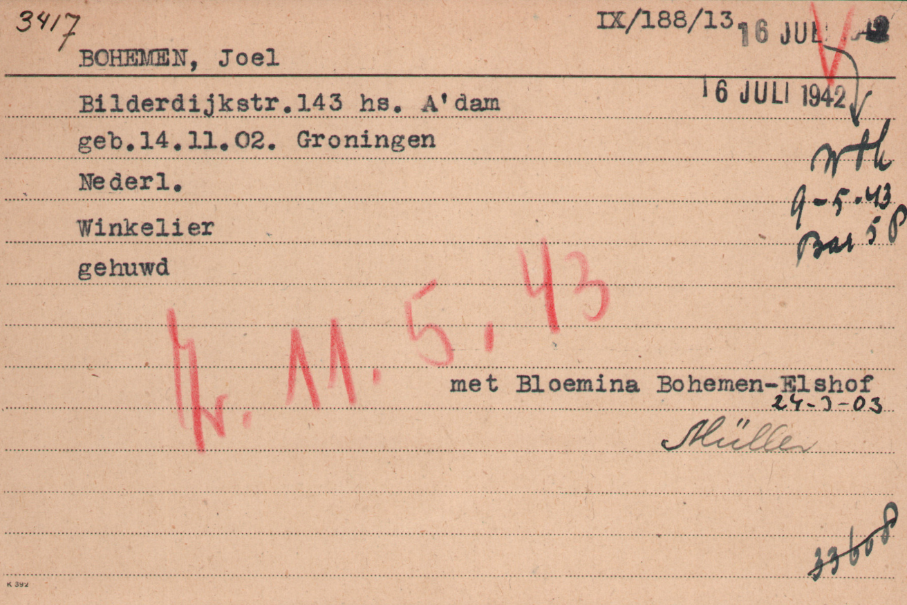 Maar dan begint de oorlog. Hoe Jo en Bloemina de eerste oorlogsjaren zijn doorkomen en hoe lang het filiaal nog in bedrijf is gebleven is niet bekend, maar in de zomer van 1942 moeten Jo en Bloemina hun huis aan de Bilderdijkstraat verlaten. Na enkele maanden in Kamp Westerbork worden ze op 11 mei 1943 'als gestraften' gedeporteerd naar Sobibor, waar ze op 14 mei, direct na aankomst, worden vermoord.
