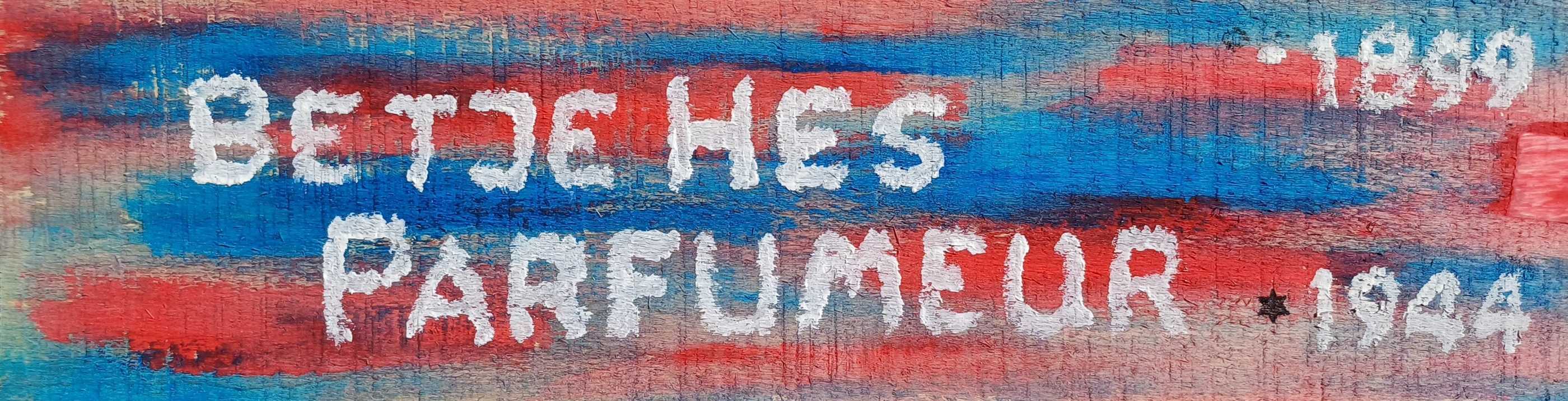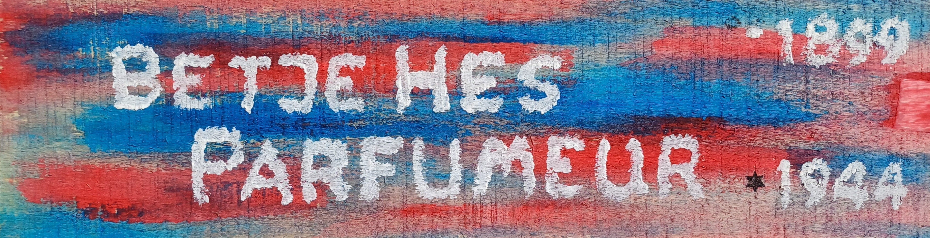 Betje Hes-Parfumeur kon het niet aan. Als wellicht extra kwetsbare persoon voelde zij het onheil al vroeg naderen. Ik heb dat in de kleuren van haar naambordje proberen uit te drukken. Maar haar naam is in wit, bovenop de onheilstinten. Zonder streepje: zij draagt zowel haar geboortenaam, als die van haar man. Zij was weerloos. En juist zó wil ik haar eren, als de zeer religieuze vrouw-die-het-niet-aankon. Nog maar 44 jaar.