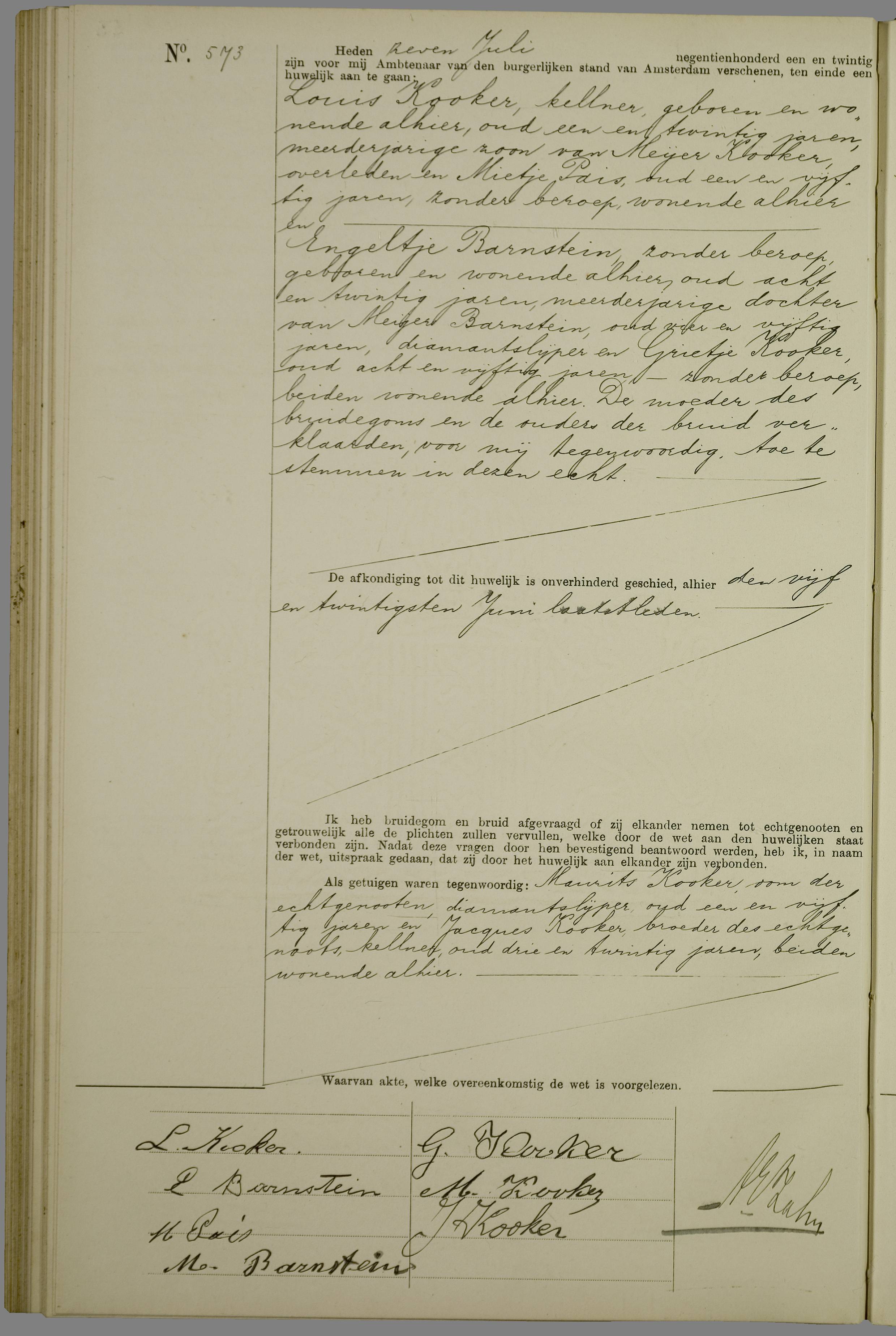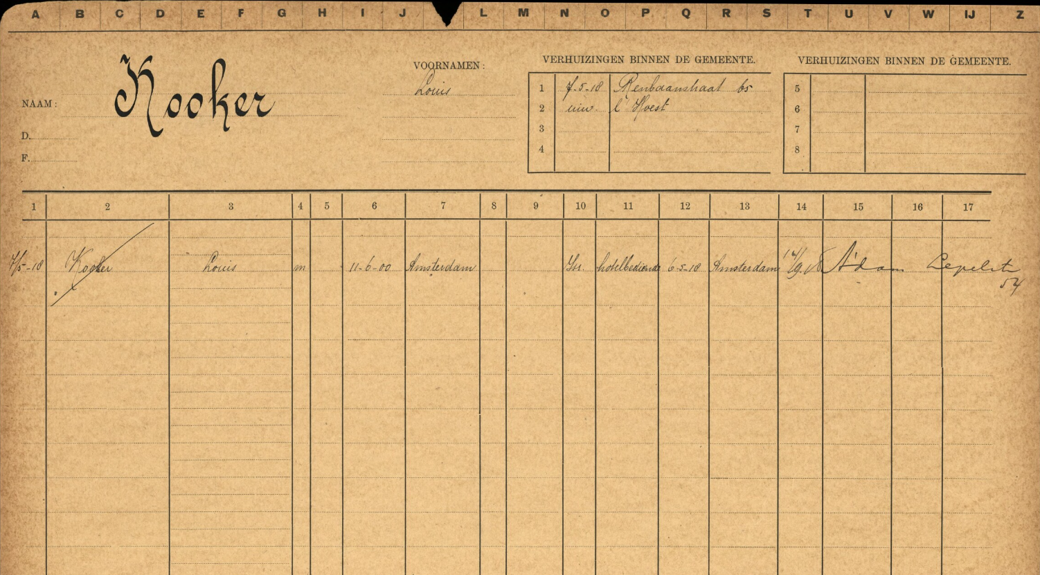 Louis was bijna achttien toen hij in 1918 naar Den Haag verhuisde om daar te werken als hotelbediende. Na een half jaar kwam hij terug naar Amsterdam. In 1919 kreeg Louis vrijstelling van militaire dienst wegens broederdienst. De broer aan wie hij dat te danken had, heette Jesaia. Hij was twee jaar ouder dan Louis en blijkbaar een voorbeeld. Want net als Jesaia werkte Louis nu als kelner, en een half jaar na het huwelijk van Jesaia Kooker met Eva Barnstein, trouwde Louis met een zus van Eva: Engeltje Barnstein. Jesaia was getuige bij het huwelijk, op 7 juli 1921 in Amsterdam.