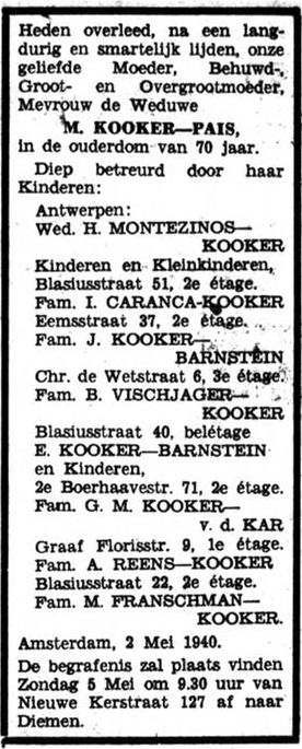 Op 2 mei 1940 overleed Louis' moeder, Mietje Kooker-Pais. In de rouwadvertentie die de familie in de krant plaatste, staan Engeltje en de kinderen wel genoemd, maar Louis niet. Hoe het ook zat tussen Louis en Engeltje, of wat er ook gebeurd was, het was vast heel pijnlijk allemaal. En dan moest het ergste nog komen. Acht dagen na het overlijden van Louis' moeder begon de oorlog.