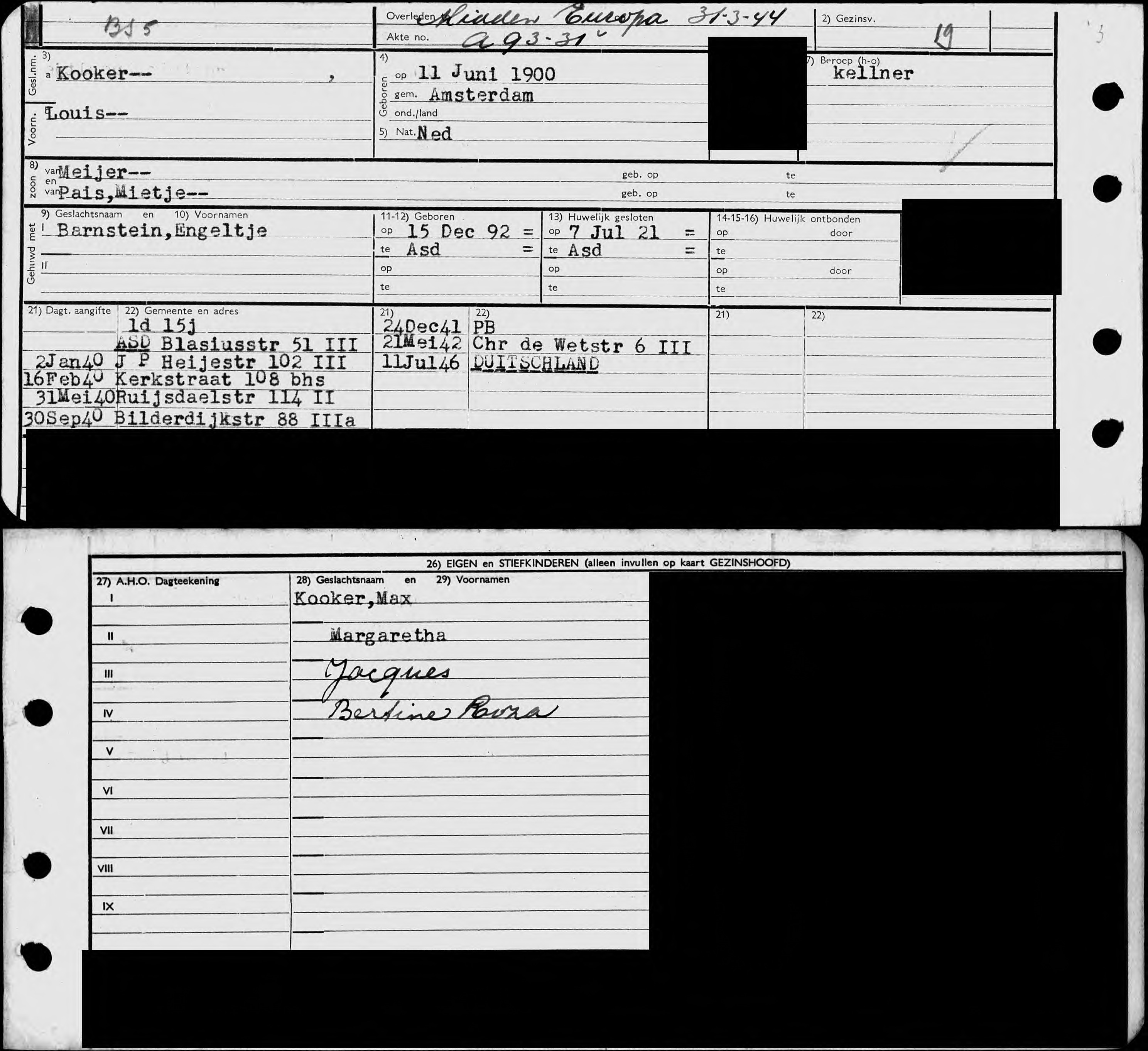 Louis was 21 en Engeltje 28 toen ze trouwden. Ze gingen wonen in de Blasiusstraat 51-3 en kregen samen vier kinderen: Max (1922), Margaretha (1923), Jacques (1926) en Bertine Roza (1929). Maar na achttien jaar huwelijk kwam het tot een breuk. Engeltje ging in oktober 1939 met de kinderen apart wonen; ze verhuisden naar Blasiusstraat 40 huis. (Vreemd toeval: ik heb zelf ook op dit adres gewoond, rond 1985). Louis begon aan een zwerftocht langs verschillende adressen.