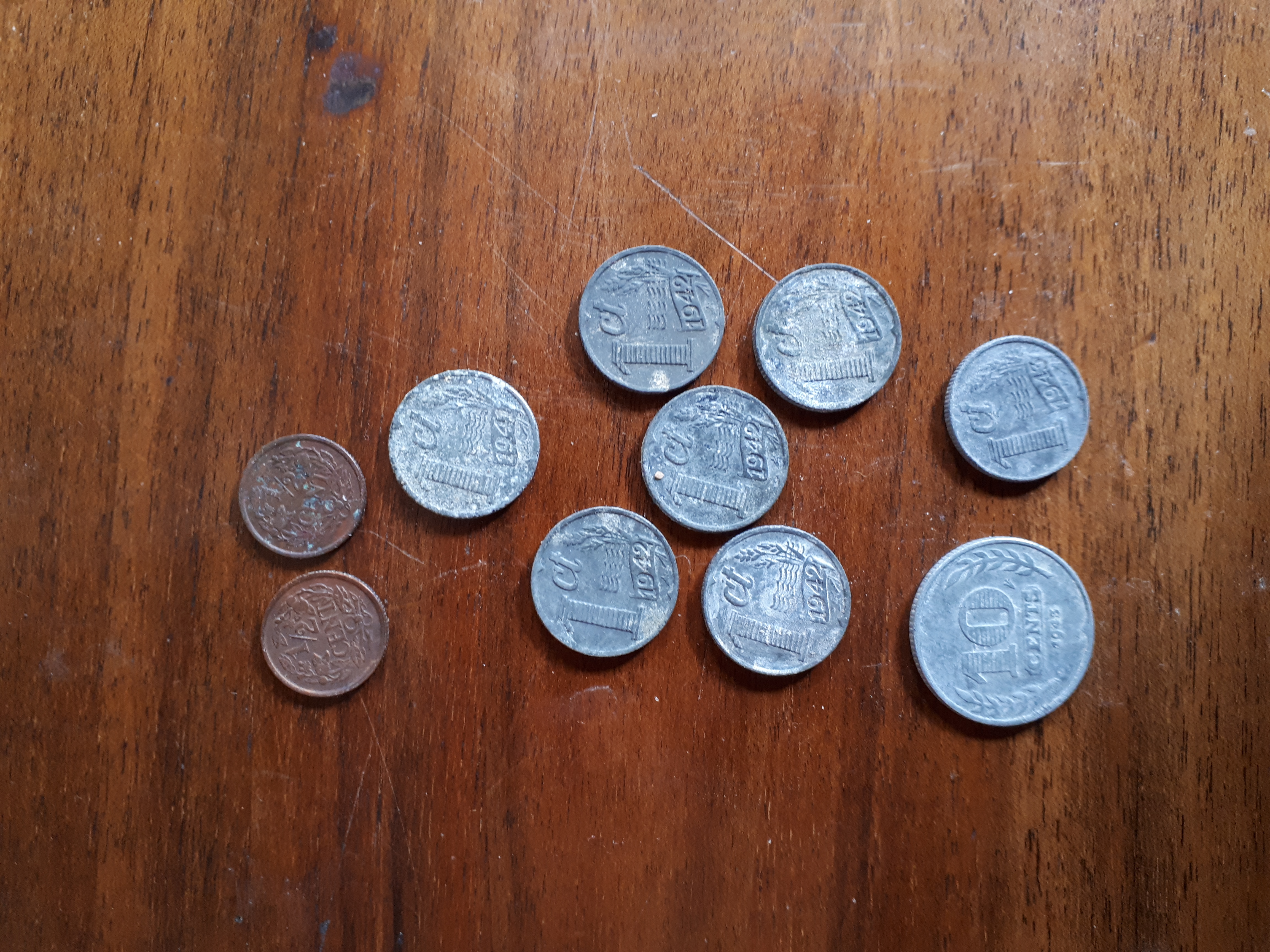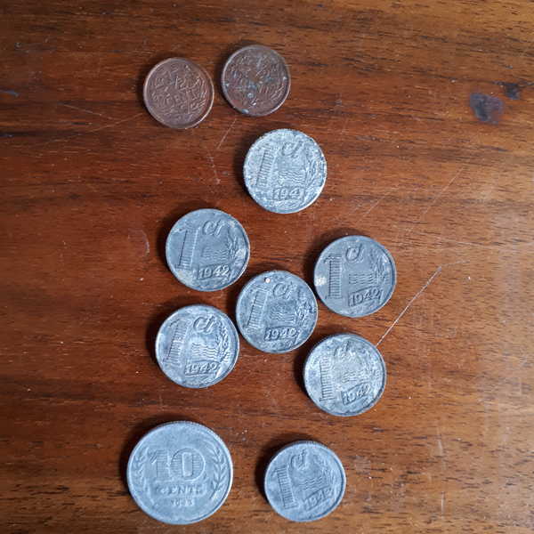 In het hele pand vonden we muntjes tussen de plint en de houten vloer, waaronder dit 'oorlogsgeld'. Alle vloeren waren scheef, waardoor muntjes, knikkers en kralen daar vanzelf terechtkwamen.