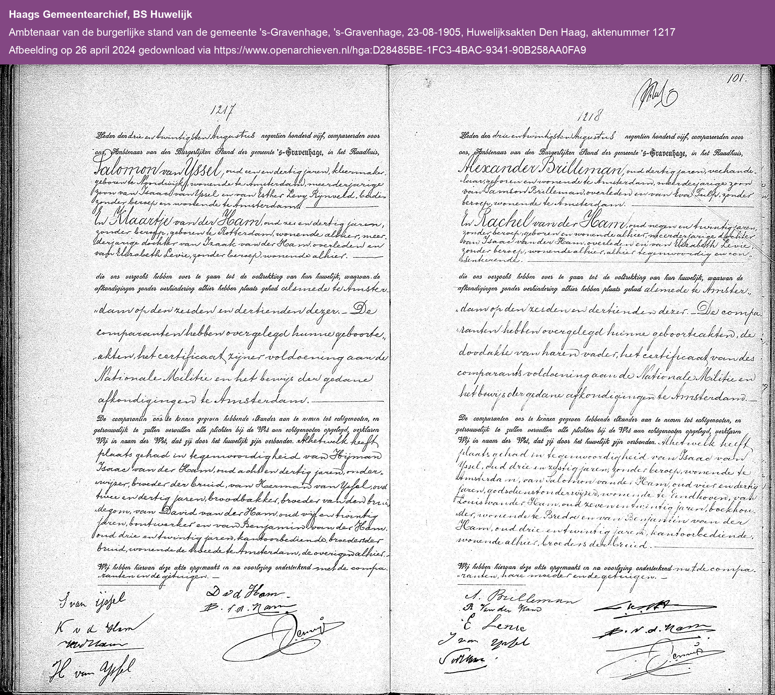 Klaartje trouwt op 36 jarige leeftijd met Salomon van IJssel op 23 augustus 1905. Drie broers van Klaartje; David, Isaac en Benjamin zijn getuige van het huwelijk evenals zwager Herman van der Ham.