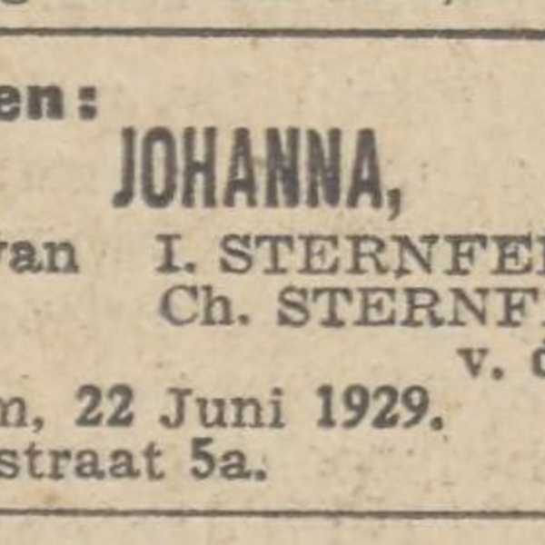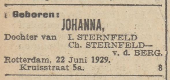 Johanna ging naar school in Den Bosch, maar werd in Rotterdam geboren. In de rubriek Familieberichten van het Rotterdamsch Nieuwsblad van 22 juni 1929 wordt haar geboorte gemeld: ‘dochter van I. Sternfeld en Ch. Sternfeld-v.d. Berg’. Het adres is Kruisstraat 5a, toen een mooie brede straat. Isaak en Charlotte wonen er op de derde verdieping sinds 29 februari 1928.