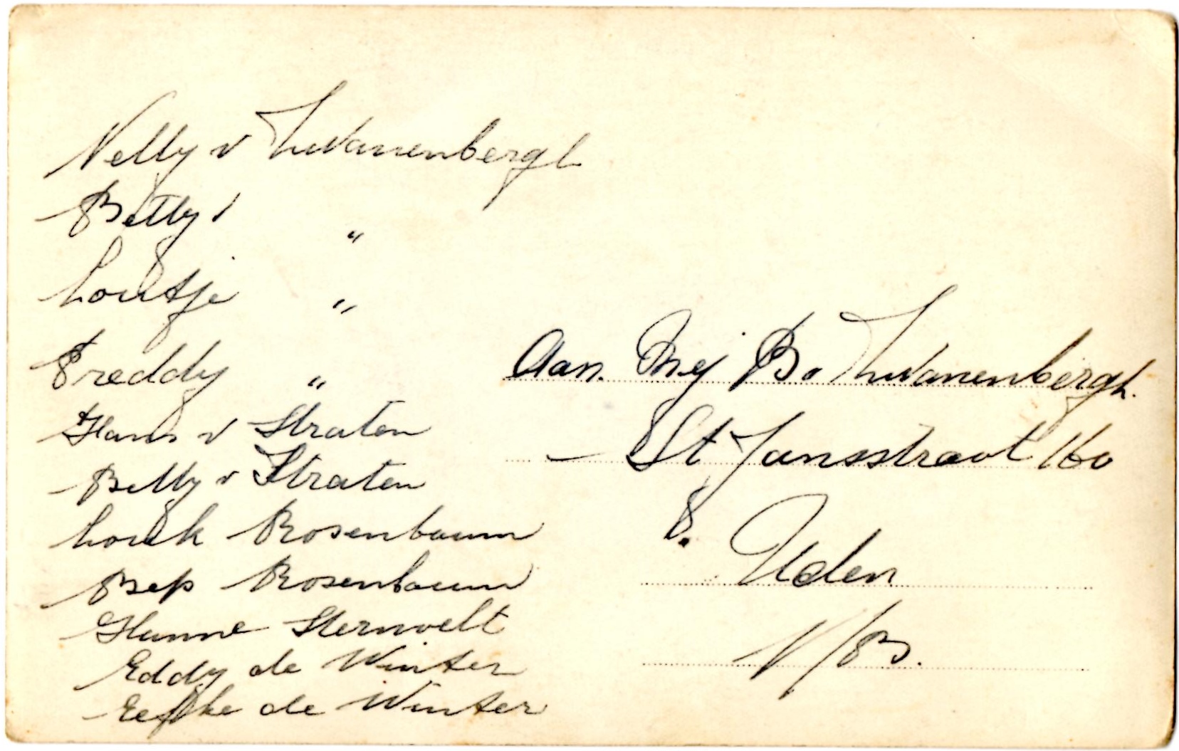 Er is nóg een foto van Johanna, ze zit in het gras in gezelschap van zes meisjes en vier jongens, die allen op de achterkant opgesomd worden. Johanna’s roepnaam blijkt Hanne. Ze zit op de tweede rij meisjes links. Dit keer kijkt ze wat bedrukt in de camera. Het groepje zit op het gras, waarschijnlijk was het een uitstapje naar een speeltuin. De meeste kinderen zijn verwant aan elkaar, zoals Elisabeth (Betty) van Straten, die net als Hanne in Den Bosch woonde. Betty was leerling aan de Rijks HBS; misschien waren zij en Hanne speciale vriendinnen. De foto werd gestuurd naar Betty van Zwanenbergh, die ook op de foto voorkomt en in Uden woonde.