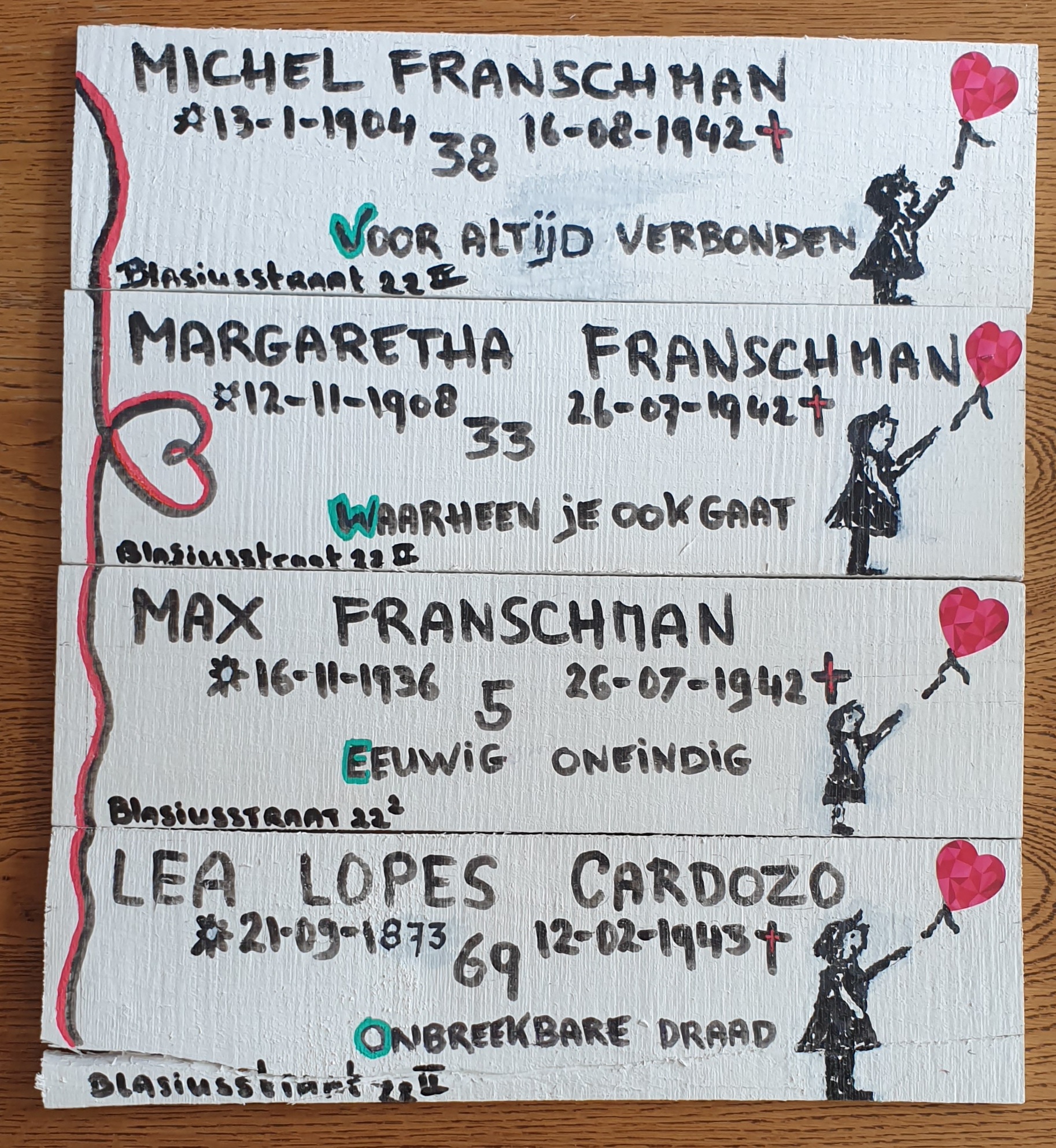 Zij woonde net als het gezin Michel, Margaretha en Max Franschman op de Blasiusstraat 22-2 in Amsterdam.