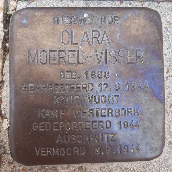 Clara Moerel-Visser, roepnaam Kitty, werd op 16 december 1888 geboren als Clara Visser en dochter van David Visser en Susanna Visser-Poppers. Zij bereikte de leeftijd van 55 jaar. Samen met haar (tweede) echtgenoot Salomon Moerel werd zij op 12 augustus 1944 op hun onderduikadres in Tilburg gearresteerd en de volgende ochtend overgebracht naar kamp Vught. Vandaar werden zij op 24 augustus naar Kamp Westerbork vervoerd vanwaar zij op 3 september naar concentratiekamp Auschwitz werden weggevoerd. Zij werd op 6 september 1944 door de nazi’s omgebracht, evenals haar echtgenoot.