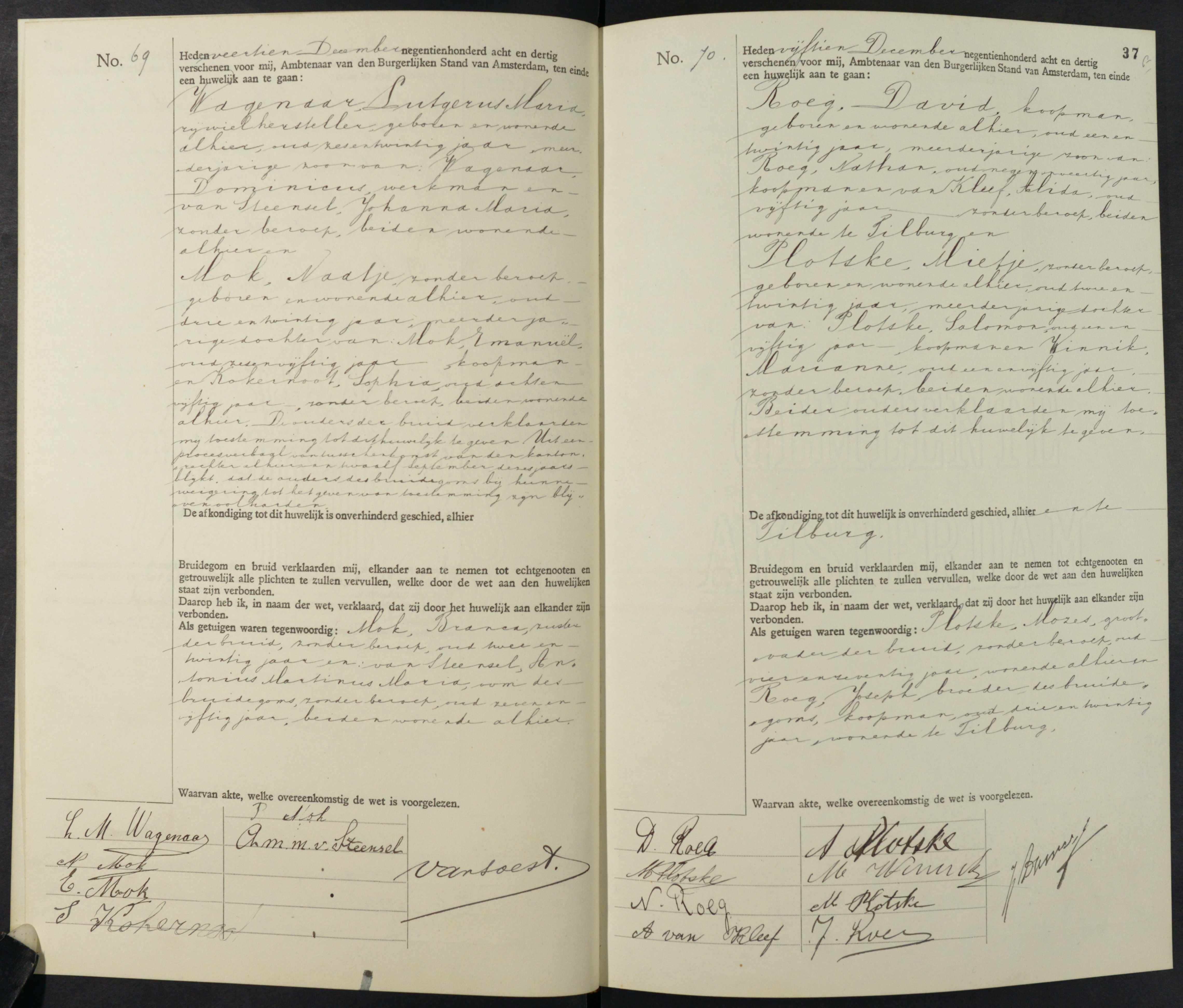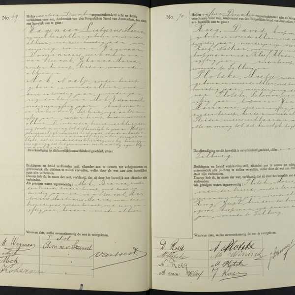 Foto 1: Op de rechterpagina de trouwakte van David en Mietje (Stadsarchief Gemeente Amsterdam)