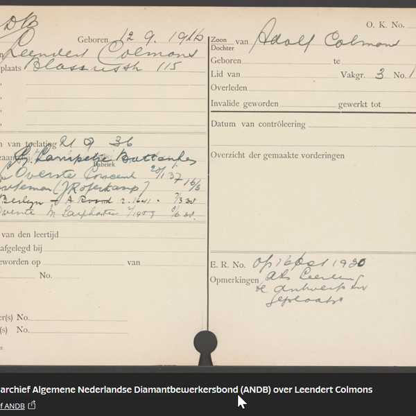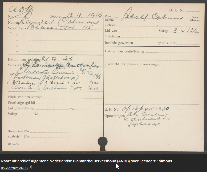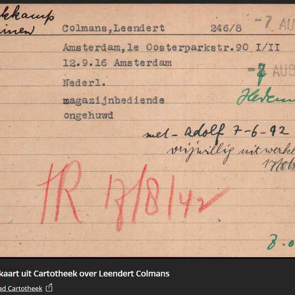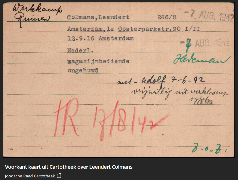 Leendert heeft in werkkamp Ruinen gezeten. Op de kaart uit de Joodsche Raad Cartotheek staat "met Adolf 7-6-92 vrijwillig uit werkkamp 17/8/42", het lijkt erop dat zijn vader daar ook zat en dat ze samen in augustus 1942 naar Westerbork zijn gebracht. Misschien dat ze elkaar een beetje hebben kunnen steunen. Uiteindelijk is Leendert in januari 1943 in Auschwitz overleden.