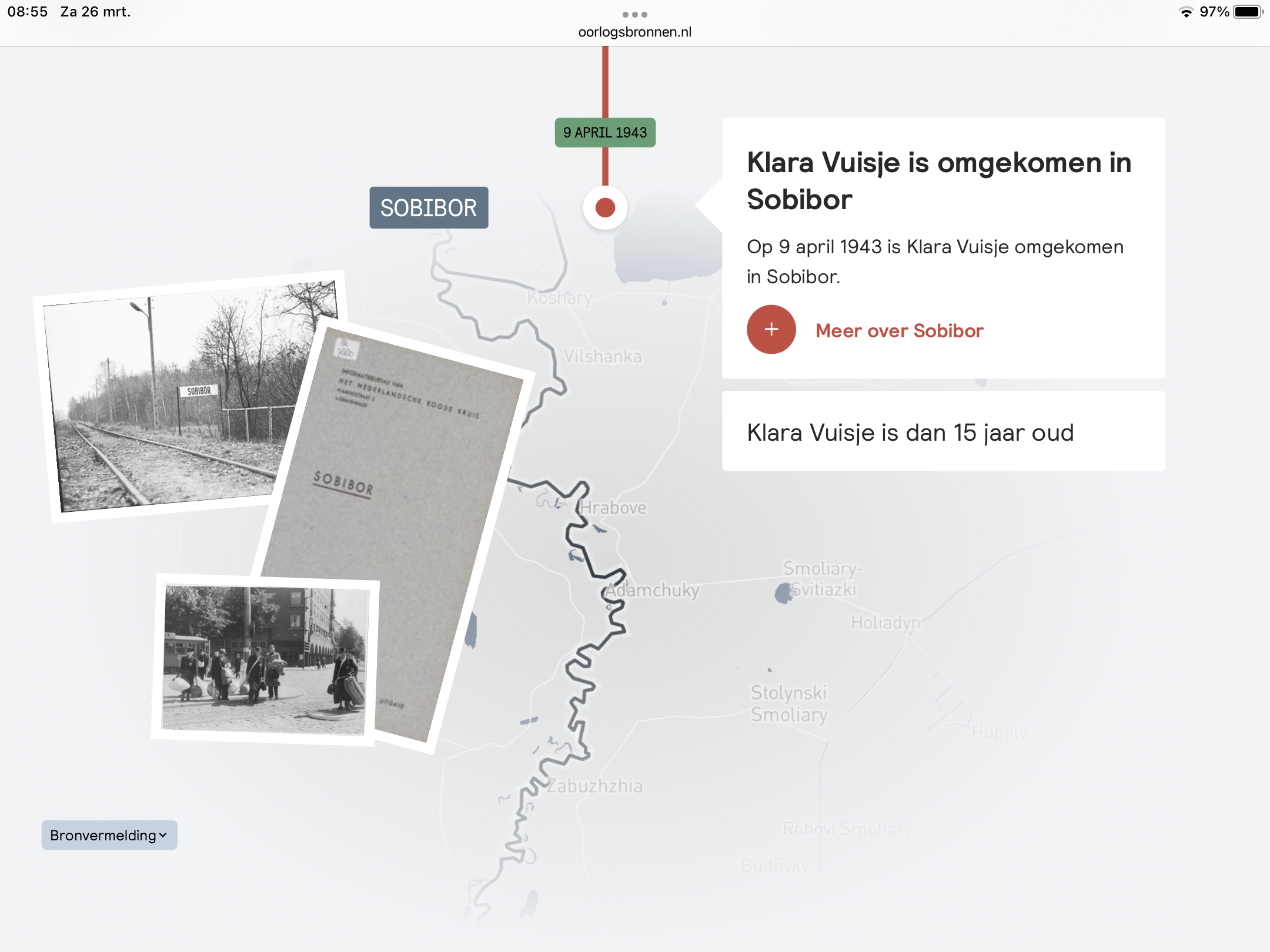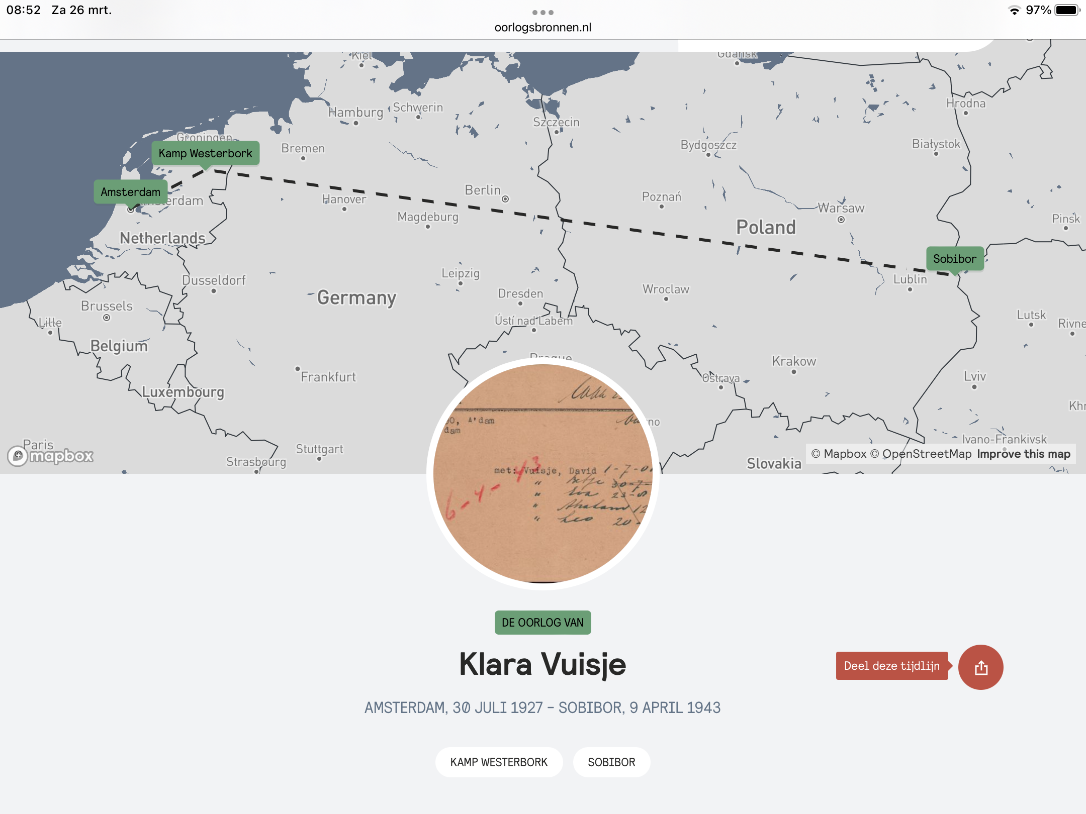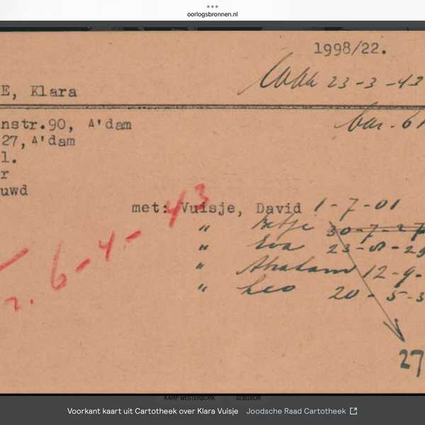 Voor Klara verslechtert het leven snel. Op 1 oktober 1940 hangen er bordjes ‘Verboden voor Joden’ bij de ingang van het Vondelpark. En er volgen steeds meer verboden voor Joden. Op 3 mei 1942 moeten alle Joden een Davidster dragen. Op 14 juli 1942 vindt het eerste transport van Amsterdamse Joden naar Westerbork plaats. Nog geen jaar later stapt ook de familie Vuisje in de trein naar Westerbork om op 6 april met elkaar op transport te gaan naar Sobibor. Ze komen daar aan op 9 april 1943 en worden meteen afgevoerd naar de gaskamer. Klara is dan nog maar 15 jaar oud.