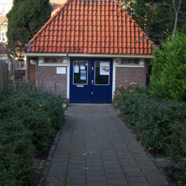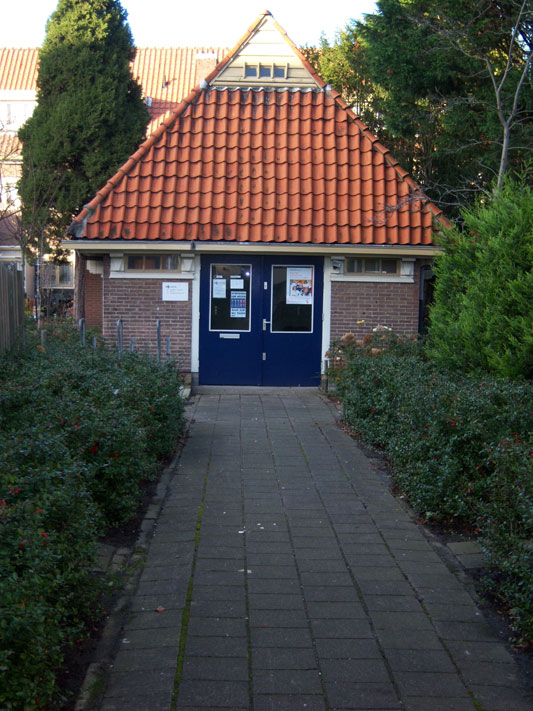 Foto: De kleine synagoge in de Tuinbouwstraat, no 26b. In 1928 ontworpen door de joodse architect Abraham Osnowicz. In 1999 wijdde Johan Cruijff dit gebouwtje in als veiligheidssteunpunt van de politie. (Joods Amsterdam)