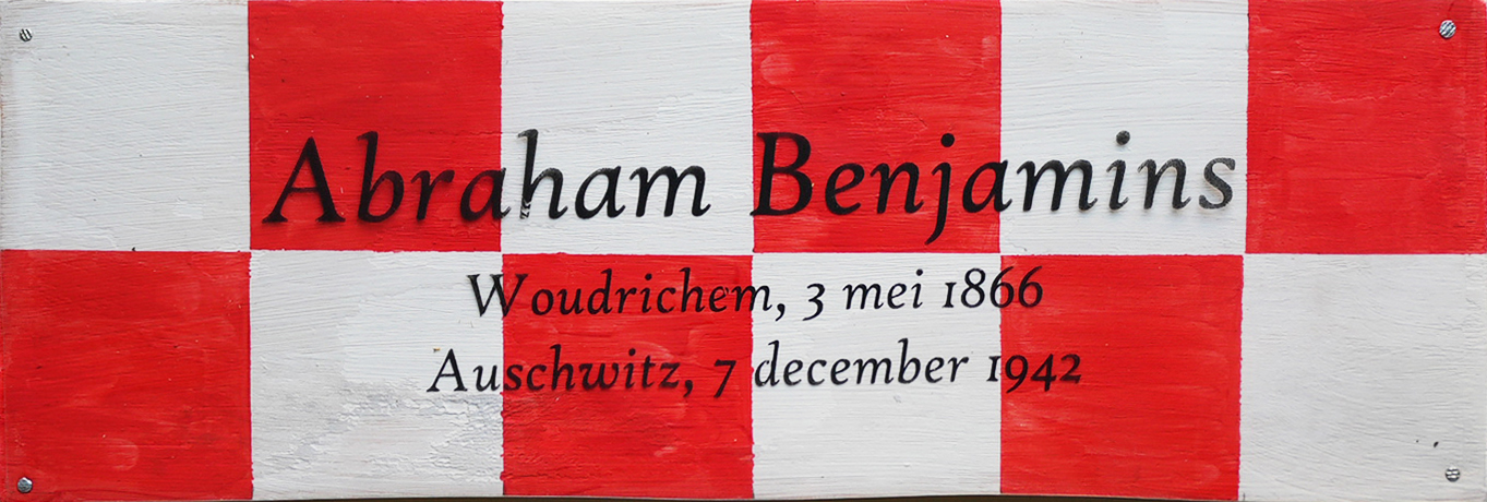 Op het naambordje dat gedeputeerde Maes neerlegde staat de naam van Abraham Benjamins. Hij werd in 1866 in Woudrichem geboren. Op het moment van zijn aanhouding door de Koninklijke Marechaussee woonde hij met zijn echtgenote en zoon aan de Kerkstraat in de plaats, op een steenworpafstand van zijn broer Hartog. Beide gezinnen inclusief Abraham’s huishoudster, in het totaal zeven personen, werden in 1942 via Westerbork naar Auschwitz gebracht. Hetzelfde lot overkwam drie inwoners van Werkendam.