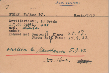 Walter Adolf Stern werd op 1 juli 1903 in Mönchengladbach geboren. Hij trouwde met Klara (Clair) Gomperts. Het paar kreeg een zoon: Rolf Peter. In de jaren '30 verhuisde het gezin naar Goch, waar Walter Adolf fabrikant was in de leerfabriek van zijn opa. Op 29 oktober 1939 vluchtten ze naar Nederland en kwamen in Breda terecht. Het adresboek van Breda vermeldt hen op het adres Julianalaan 13 met als beroep leerfabrikant.
