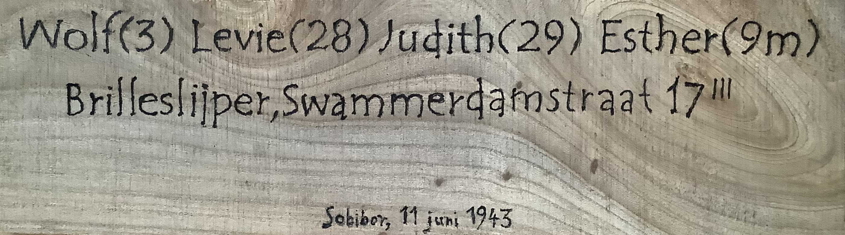 Vanuit mijn huis zijn zeven mensen weggevoerd en vermoord. Daar heb ik naambordjes voor gemaakt. Kijkend in de straat vond ik dat aan de overkant ook veel slachtoffers waren oa Wolf Wolf: zo’n naam! Maar vandaag zag ik dat hij en de zijnen intussen worden herdacht. Ik vond in hetzelfde huis nog een Wolf, nou ja een Wolfje, hij was pas 3 jaar toen hij ging. Samen met Esther, zij was 9 maanden. Moeder Judith was 29 jaar. Hoe ging dat ? Met Esther op de arm en Wolf aan de hand? 11 juni 1943 was een mooie zomerdag.