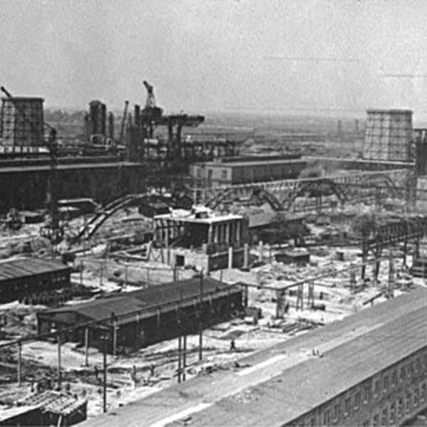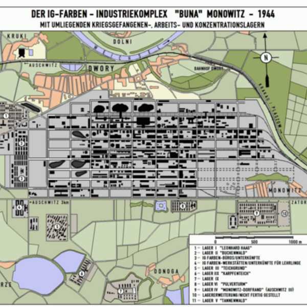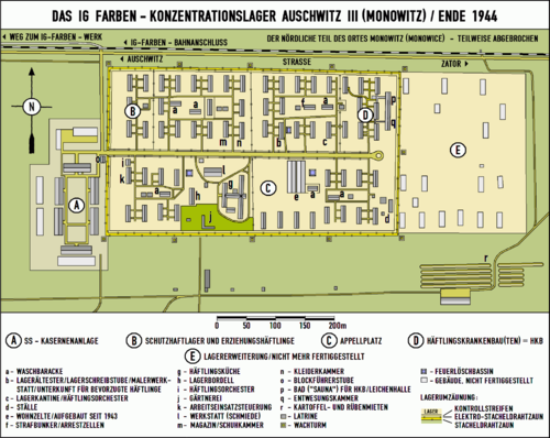 foto's: Bundes Archiv - de fabriek IG Farben in aanbouw 1942 en voltooid in 1943, plattegronden van Monowitz-Buna en IG Farben