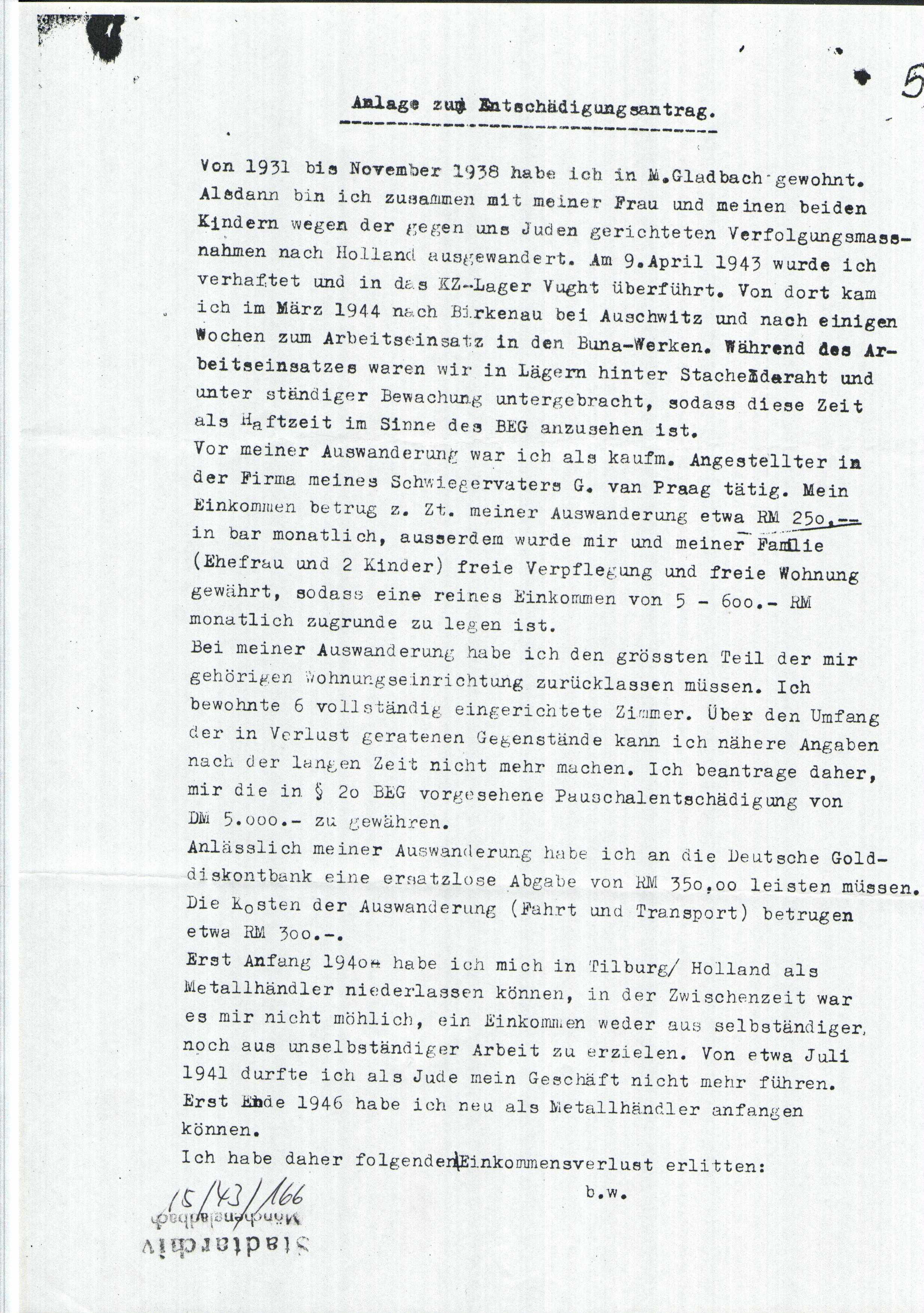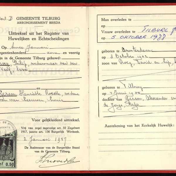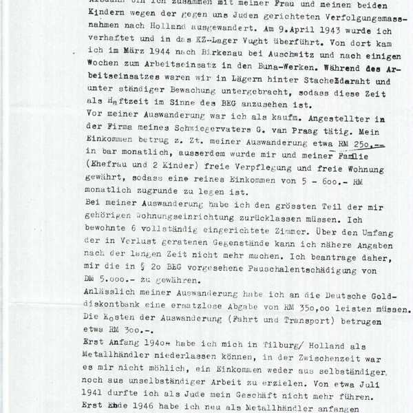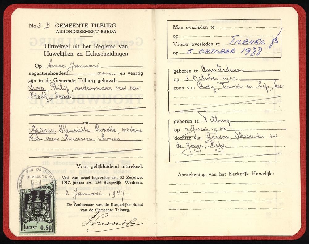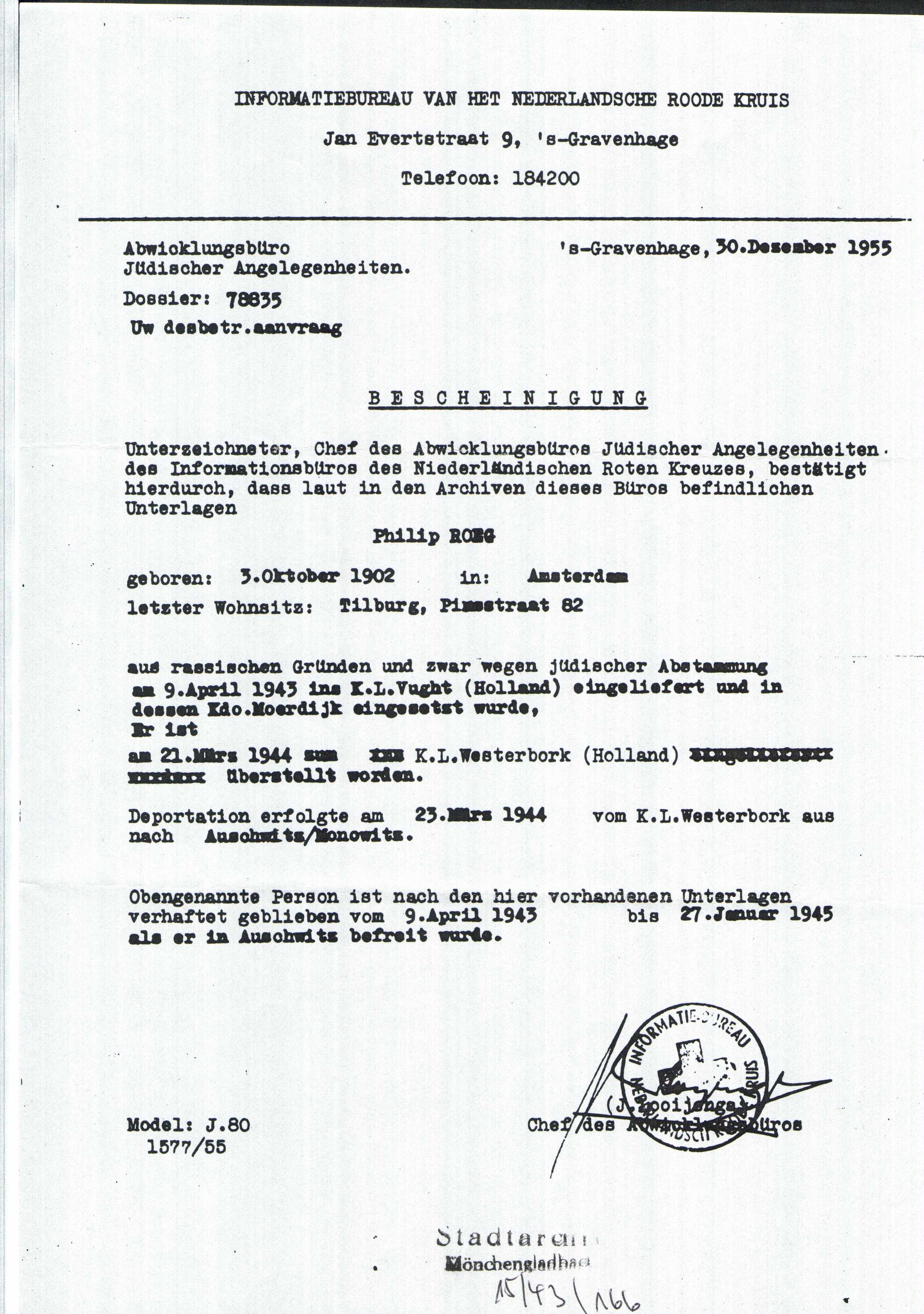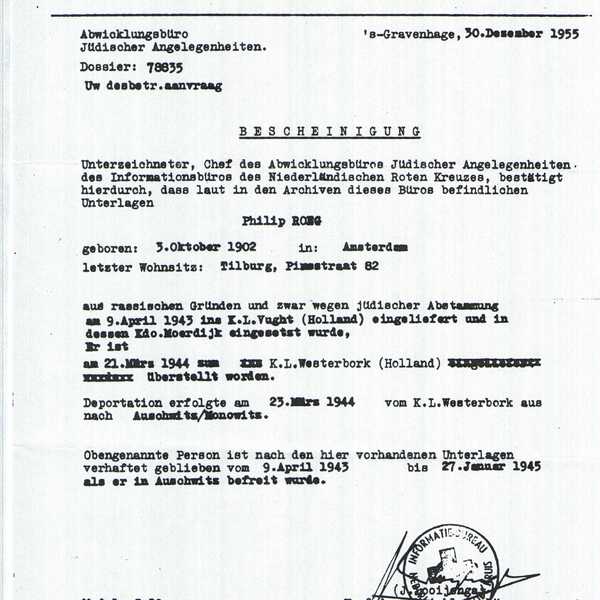 Haar man, Philip is in maart 1944 vanuit Kamp Vught, via Kamp Westerbork overgebracht naar Auschwitz en te werk gesteld bij de Buna-Werken (*). Op 27 januari 1945 is hij daar bevrijd. Philip is teruggekeerd naar Tilburg, waar hij op 2 januari 1947 hertrouwde met Henriëtte Gerson, weduwe van Louis van Leeuwen (*). Louis is in augustus 1944 in Auschwitz vermoord. Philip is overleden op 7 juli 1981 (*) en bijgezet op de Joodse begraafplaats in Tilburg , waar ook een monument is ingericht voor alle omgekomen Joden (*)